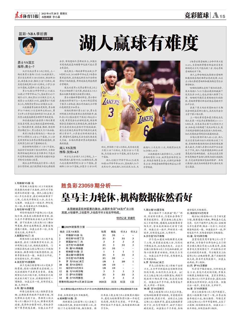 上一场比赛贝恩和莫兰特成为灰熊队史第一对在季后赛都得到30+10+5的队友,贝恩在季后赛可以得到25.2分,他和莫兰特构建了灰熊后场火力,莫兰特则会增强突破迫使湖人防线回收,如此贝恩就会得到空位投篮的机会。