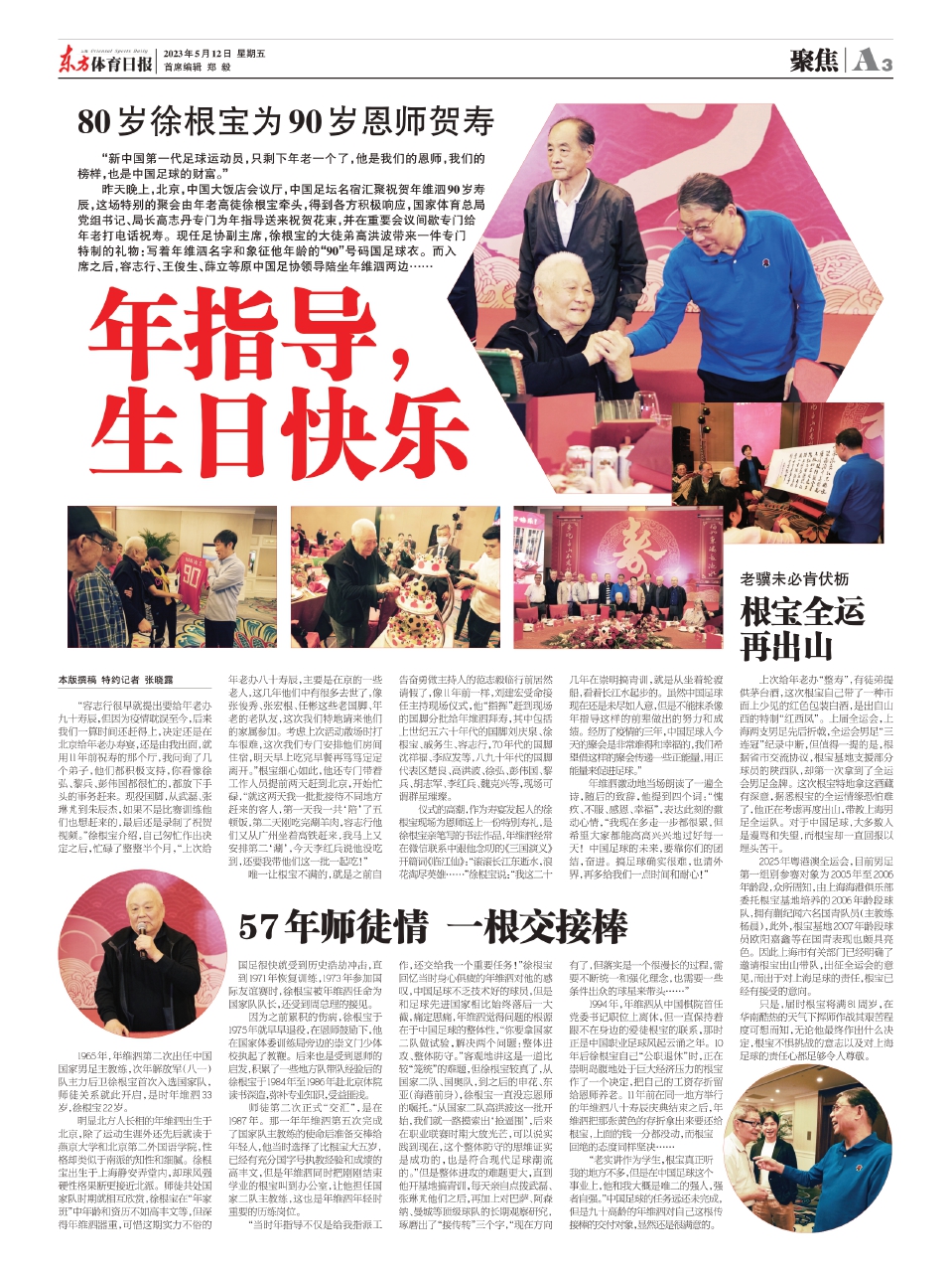 昨天晚上,北京,中国大饭店会议厅,中国足坛名宿汇聚祝贺年维泗90岁寿辰,这场特别的聚会由年老高徒徐根宝牵头,得到各方积极响应,国家体育总局党组书记、局长高志丹专门为年指导送来祝贺花束,并在重要会议间歇专门给年老打电话祝寿。现任足协副主席,徐根宝的大徒弟高洪波带来一件专门特制的礼物:写着年维泗名字和象征他年龄的“90”号码国足球衣。而入席之后,容志行、王俊生、薛立等原中国足协领导陪坐年维泗两边……