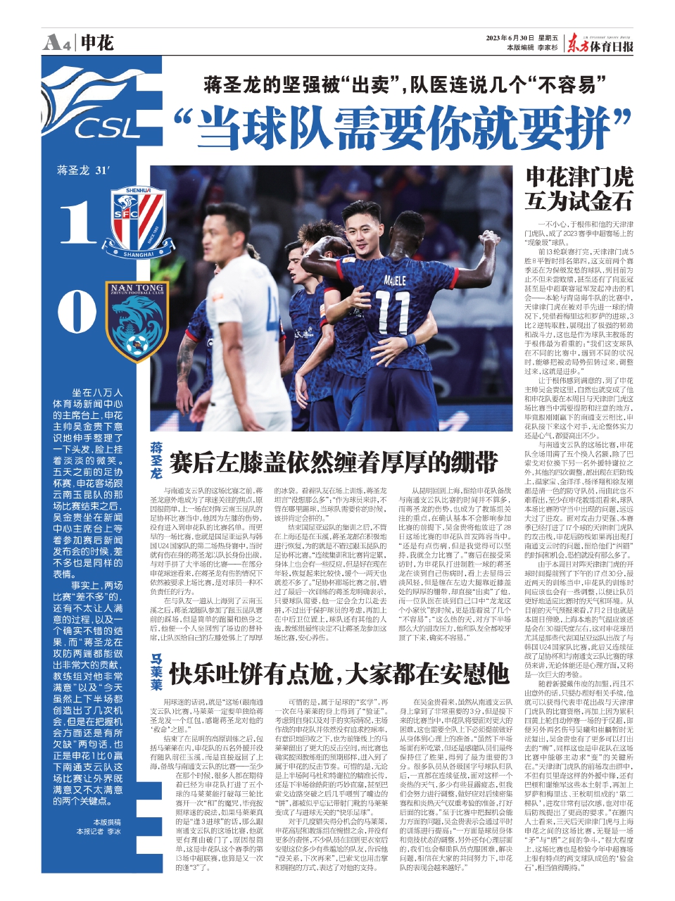 从昆明回到上海,留给申花队备战与南通支云队比赛的时间并不算多,而蒋圣龙的伤势,也成为了教练组关注的重点,在确认基本不会影响参加比赛的前提下,吴金贵将他放进了28日这场比赛的申花队首发阵容当中。“还是有点伤病,但是我觉得可以坚持,我就全力比赛了。”赛后在接受采访时,为申花队打进制胜一球的蒋圣龙在谈到自己伤病时,看上去显得云淡风轻,但是缠在左边大腿靠近膝盖处的厚厚的绷带,却直接“出卖”了他,而一位队医在谈到自己口中“龙龙这个小家伙”的时候,更是连着说了几个“不容易”:“这么热的天,对方下半场那么大的进攻压力,他和队友全都咬牙顶了下来,确实不容易。”