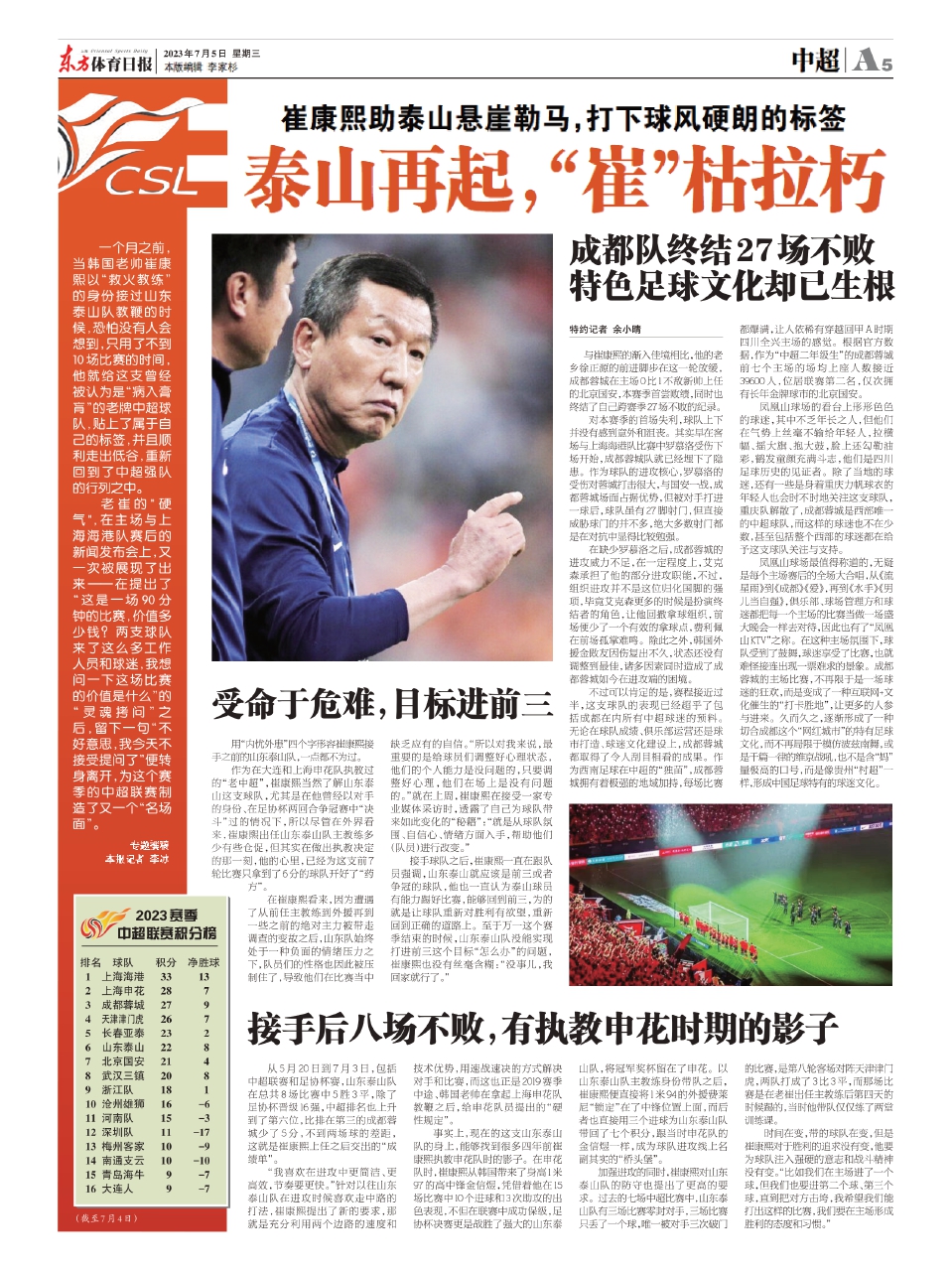 从5月20日到7月3日,包括中超联赛和足协杯赛,山东泰山队在总共8场比赛中5胜3平,除了足协杯晋级16强,中超排名也上升到了第六位,比排在第三的成都蓉城少了5分,不到两场球的差距,这就是崔康熙上任之后交出的“成绩单”。