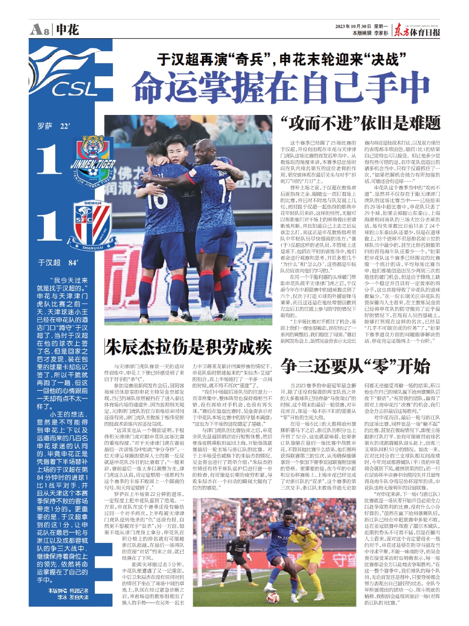 罗萨在上半场第22分钟的进球,一定程度上把申花队逼到了绝境。一方面,申花队在这个赛季还没有输给过同一个对手两次,上半程被天津津门虎队逆转绝杀的“仇”还没有报,自然更不想被对手“双杀”;另一方面,如果不能从津门虎身上拿分,申花队在积分榜上的排名就有可能被浙江队超越,在最后一场两队的直接“对话”到来之前,就已经落在了下风。