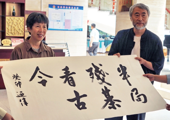 这次在晋城,同样爱好书法的武宫正树受邀挥毫“神游”两个大字。难得写大字的芮乃伟紧随其后写下一幅中堂:“半局残棋看古今”。江铸久则写了“棋源、太行、康养、晋城”四对扇子,作为棋手抽签使用,没想到抽完签后全被抢去收藏了。这一幕也足以证明,围棋本身就是传统文化。
