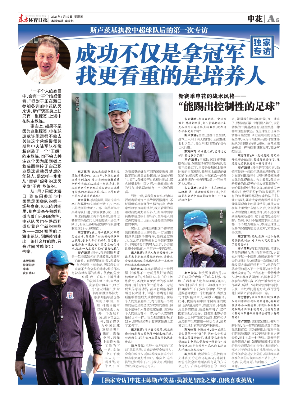 斯卢茨基:申花队2023赛季的所有比赛,包括足协杯的那场决赛,我都已经看过了,只要是参加过上赛季比赛的申花球员,我基本上都是能够知道(他们表现)的,当然这次一起参加准备期的一些年轻队员,一开始是不大认识的。