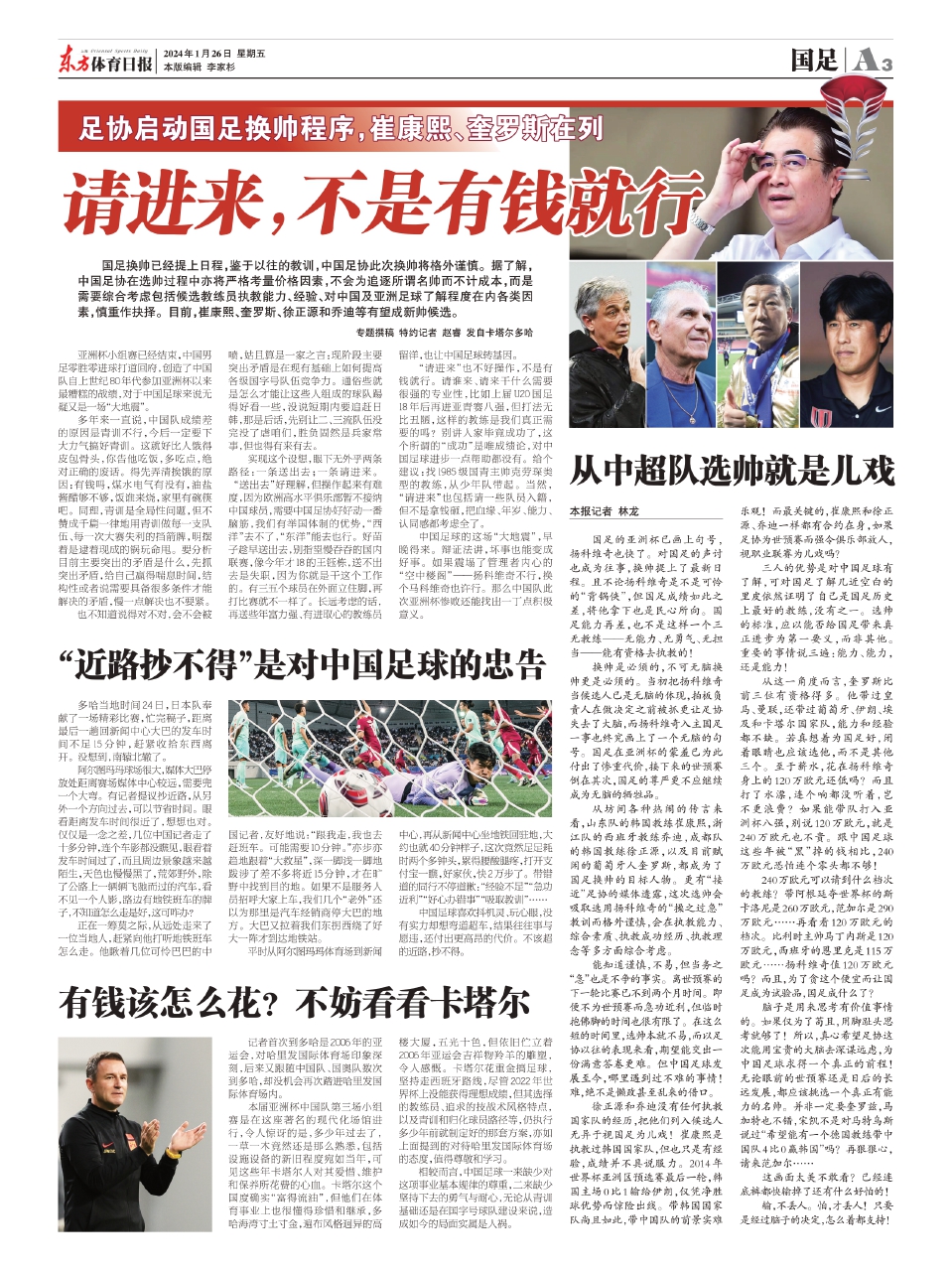实现这个设想,眼下无外乎两条路径:一条送出去;一条请进来。“送出去”好理解,但操作起来有难度,因为欧洲高水平俱乐部暂不接纳中国球员,需要中国足协好好动一番脑筋,我们有举国体制的优势,“西洋”去不了,“东洋”能去也行。好苗子趁早送出去,别指望慢吞吞的国内联赛,像今年才18的王钰栋,送不出去是失职,因为你就是干这个工作的。有三五个球员在外面立住脚,再打比赛就不一样了。长远考虑的话,再送些年富力强、有进取心的教练员留洋,也让中国足球转基因。
