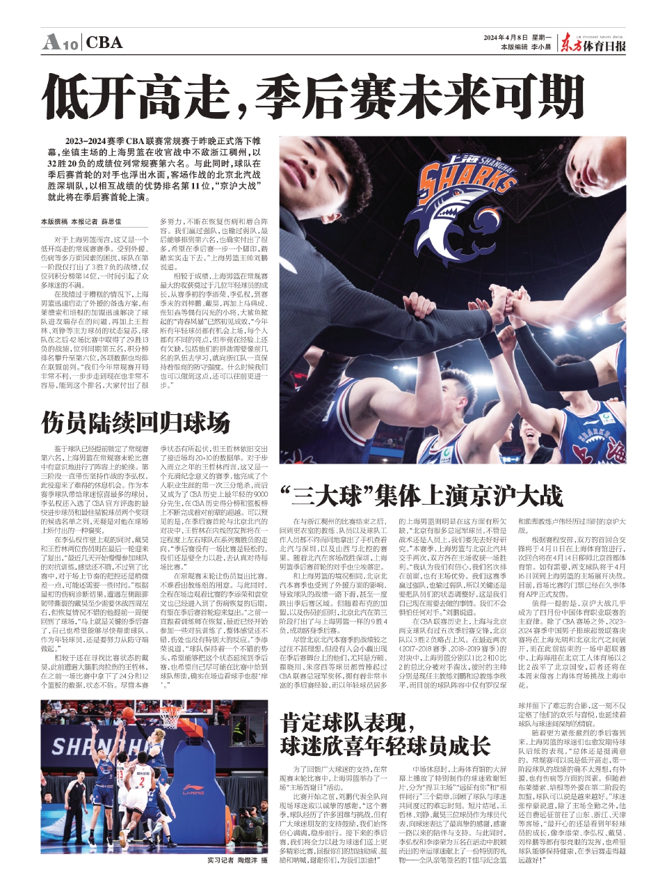 相较于成绩,上海男篮在常规赛最大的收获莫过于几位年轻球员的成长,从赛季初的李添荣、李弘权,到赛季末的刘梓鹏、戴昊,再加上马典成、张知垚等偶有闪光的小将,大鲨鱼掀起的“青春风暴”已然初见成效,“今年所有年轻球员都有机会上场,每个人都有不同的亮点,但毕竟在经验上还有欠缺,包括他们的拼劲需要像前几名的队伍去学习,就向浙江队一直保持着很高的防守强度。什么时候我们也可以做到这点,还可以往前更进一步。”