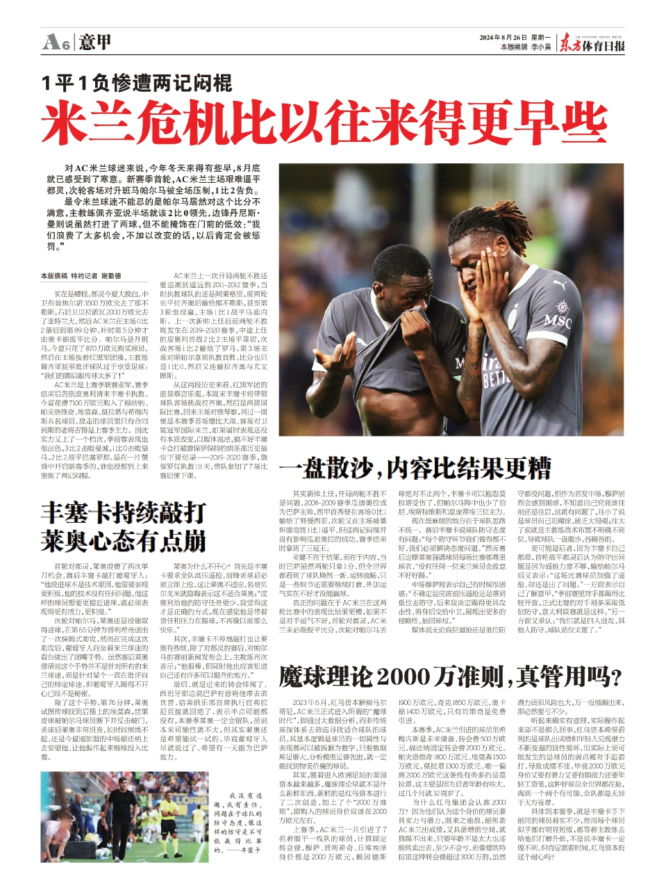 对AC米兰球迷来说,今年冬天来得有些早,8月底就已感受到了寒意。新赛季首轮,AC米兰主场艰难逼平都灵,次轮客场对升班马帕尔马被全场压制,1比2告负。