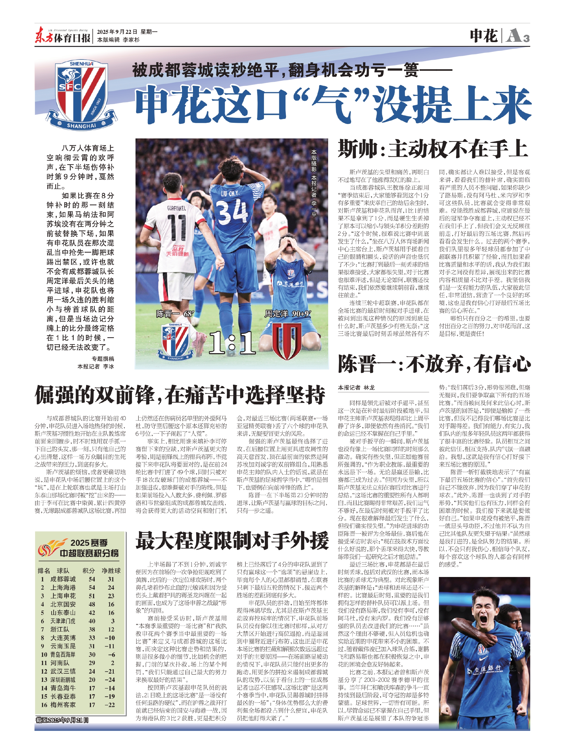 赛前接受采访时,斯卢茨基用“本赛季最重要的一场比赛”和“我执教申花两个赛季当中最重要的一场比赛”来定义与成都蓉城的这场比赛,而决定这种比赛走势和结果的,则是很多微小的细节,比如机会的把握,门前的某次扑救,场上的某个判罚,“我们只能通过自己最大的努力来换取最好的结果”。