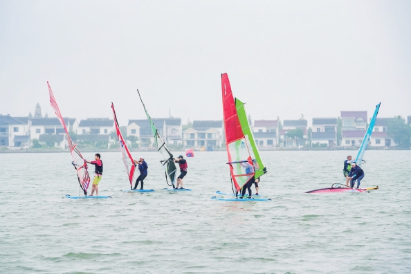 9月20日,第五届长三角体育节帆板比赛在青浦区金坞半岛鸣笛开赛,来自江苏、浙江、安徽、上海的200余名帆板爱好者齐聚淀山湖畔,展开为期两天的激烈角逐。