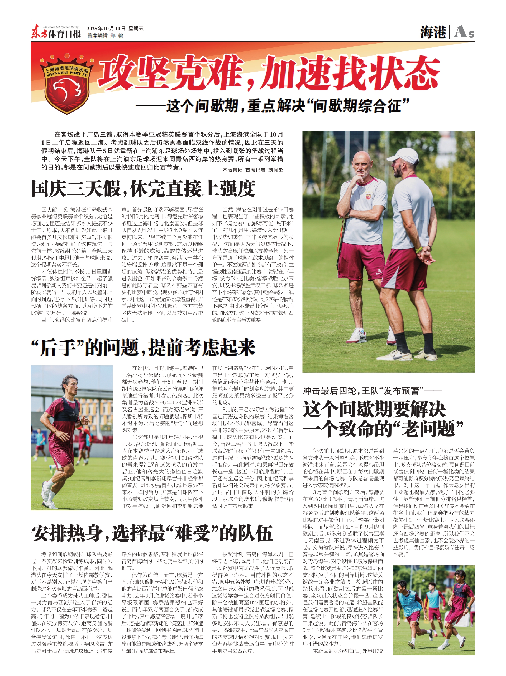 3月首个间歇期归来后,海港队在客场3比3战平了青岛西海岸。进入到6月国际比赛日后,海港队又在客场最后时刻被浙江队绝平,这两场比赛的对手都非目前积分榜第一集团球队。而尽管此前在8月和9月的间歇期过后,球队分别战胜了长春亚泰与云南玉昆,不过整体过程颇为不易。对海港队来说,尽快进入比赛节奏是非常关键的一点,尤其是客场面对青岛海牛,对手设擂主场为保级而战,整个比赛氛围必然非常激烈。“两支球队为了不同的目标拼搏,这场关键战一定会非常精彩。按照以往的经验来看,间歇期之后的第一场比赛,全队进入状态会偏慢一些,这也是我们需要警惕的问题,希望全队能在这场比赛开始前,迅速进入比赛节奏,延续上一阶段的良好状态。”队长王燊超说。此前,青岛海牛队在客场0比1不敌梅州客家、2比2战平长春亚泰,反倒是在主场,他们总能迸发出不错的战斗力。