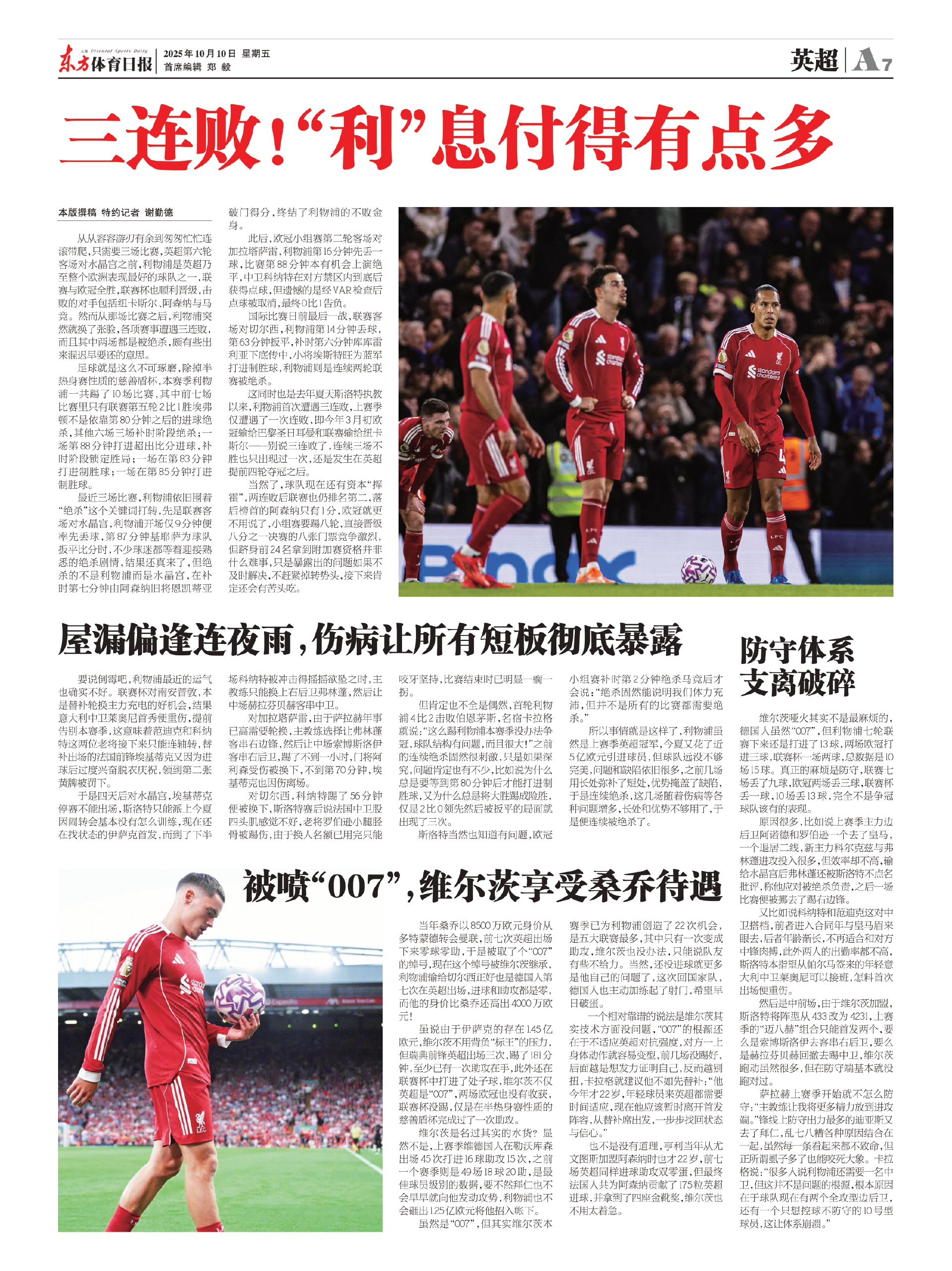 维尔茨哑火其实不是最麻烦的,德国人虽然“007”,但利物浦七轮联赛下来还是打进了13球,两场欧冠打进三球,联赛杯一场两球,总数据是10场15球。真正的麻烦是防守,联赛七场丢了九球,欧冠两场丢三球,联赛杯丢一球,10场丢13球,完全不是争冠球队该有的表现。