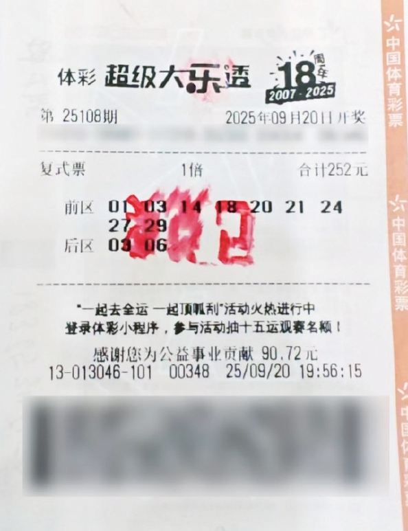 9月20日,超级大乐透第25108期开奖,前区开出号码14、18、21、24、29;后区开出号码03、06。当期上海开出1注基础一等奖,出自一张“9+2”票面金额为252元的复式票,单票奖金1007万余元。该张大乐透一等奖彩票出自位于嘉定区外冈镇北街春及路37号的13046网点。