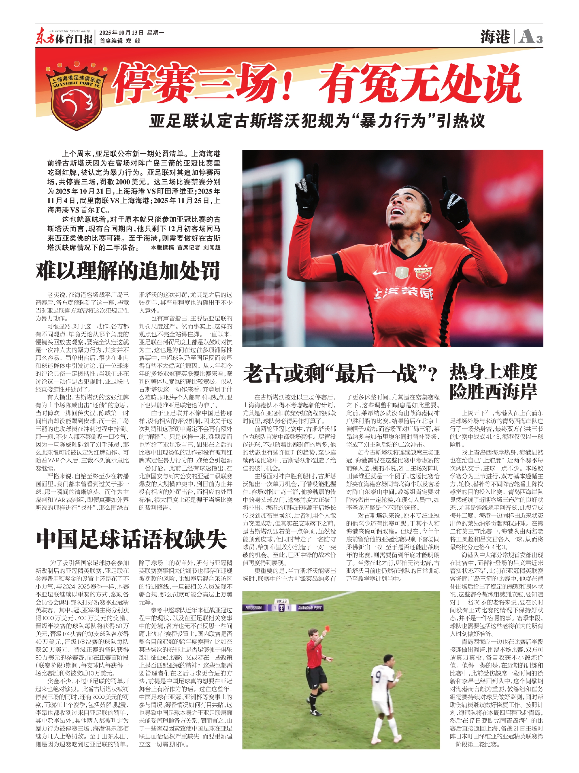 上个周末,亚足联公布新一期处罚清单。上海海港前锋古斯塔沃因为在客场对阵广岛三箭的亚冠比赛里吃到红牌,被认定为暴力行为。亚足联对其追加停赛两场,共停赛三场,罚款2000美元。这三场比赛禁赛分别为2025年10月21日,上海海港VS町田泽维亚;2025年11月4日,武里南联VS上海海港;2025年11月25日,上海海港VS首尔FC。