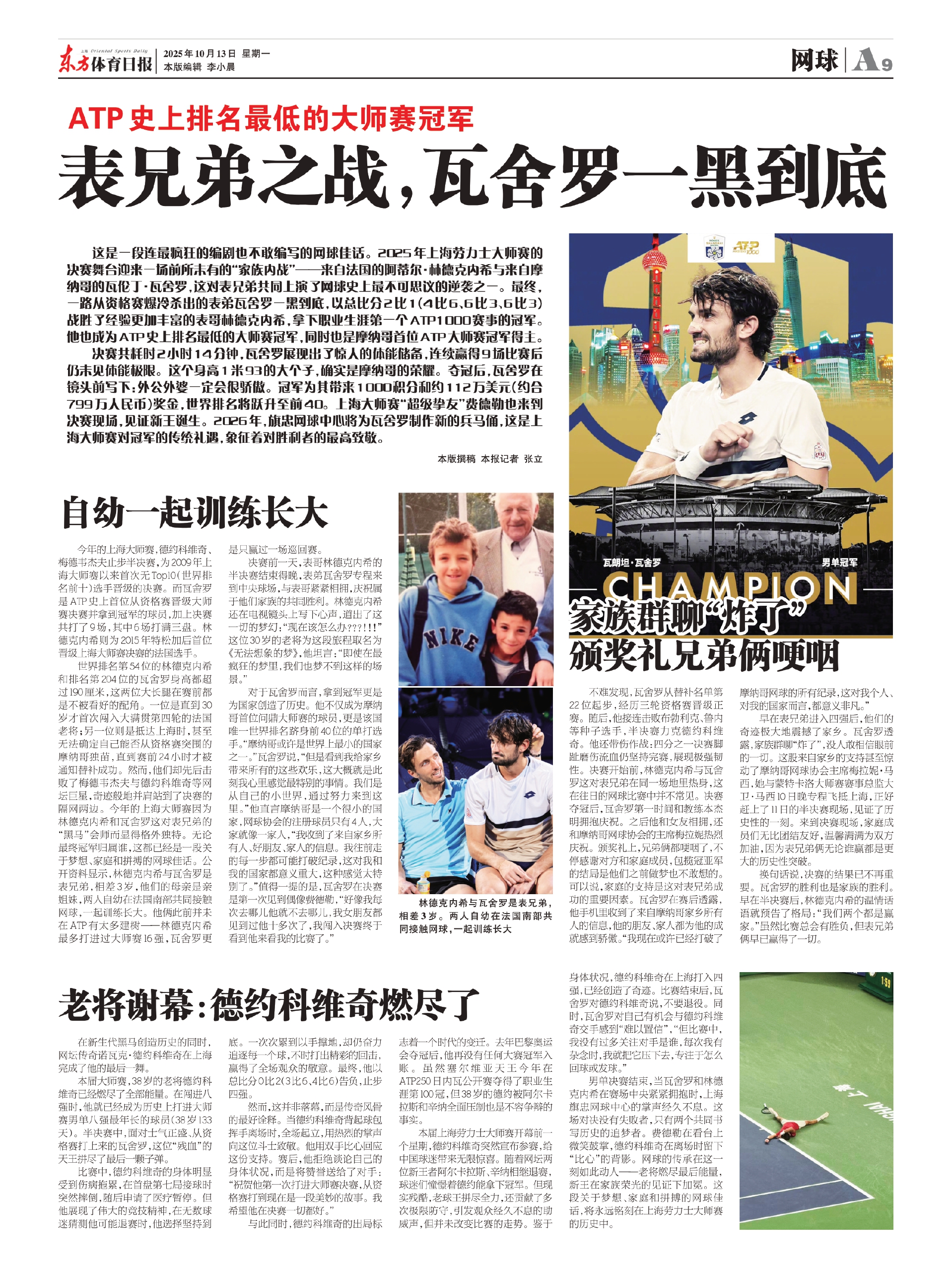 这是一段连最疯狂的编剧也不敢编写的网球佳话。2025年上海劳力士大师赛的决赛舞台迎来一场前所未有的“家族内战”——来自法国的阿蒂尔·林德克内希与来自摩纳哥的瓦伦丁·瓦舍罗,这对表兄弟共同上演了网球史上最不可思议的逆袭之一。最终,一路从资格赛爆冷杀出的表弟瓦舍罗一黑到底,以总比分2比1(4比6、6比3、6比3)战胜了经验更加丰富的表哥林德克内希,拿下职业生涯第一个ATP1000赛事的冠军。他也成为ATP史上排名最低的大师赛冠军,同时也是摩纳哥首位ATP大师赛冠军得主。