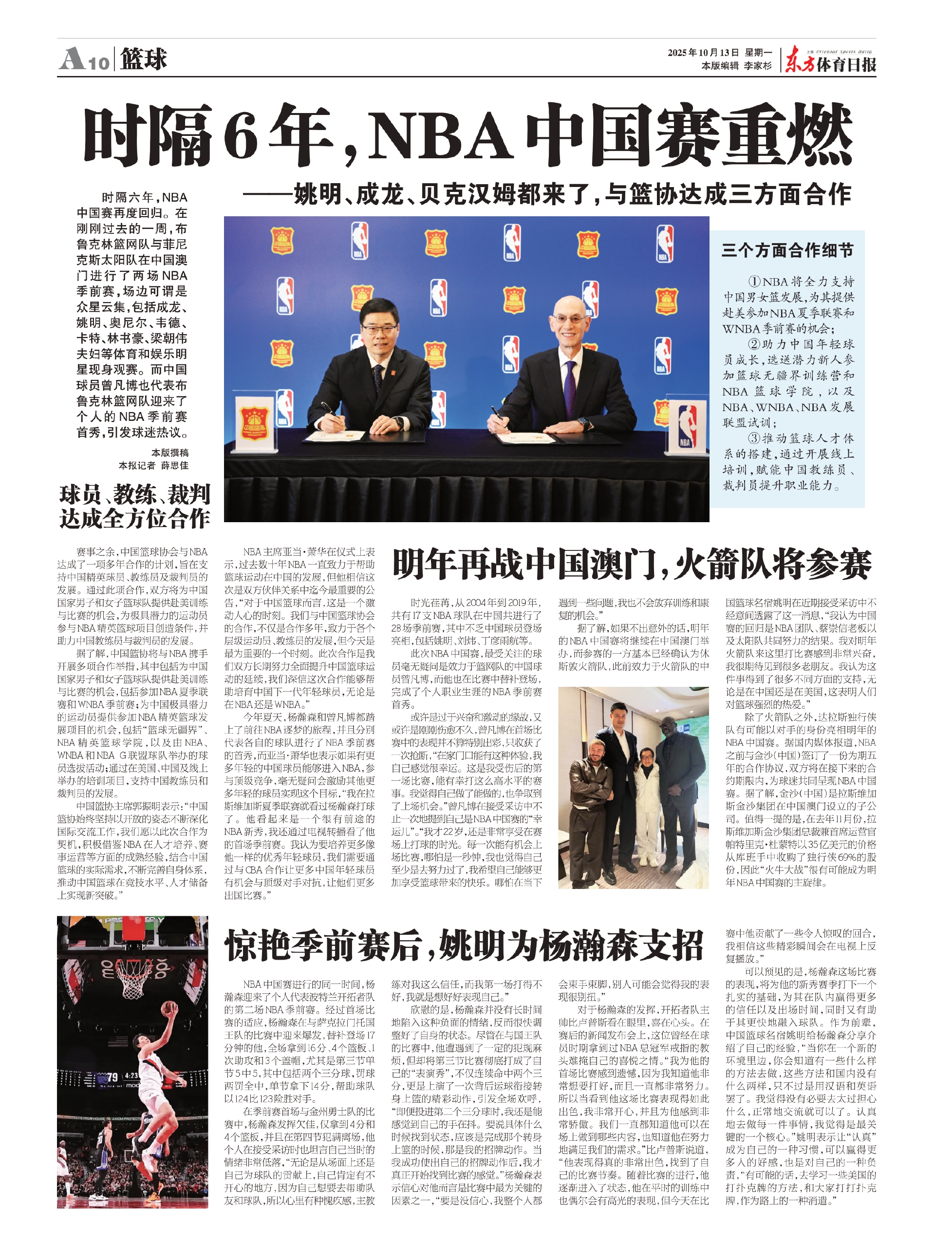 赛事之余,中国篮球协会与NBA达成了一项多年合作的计划,旨在支持中国精英球员、教练员及裁判员的发展。通过此项合作,双方将为中国国家男子和女子篮球队提供赴美训练与比赛的机会,为极具潜力的运动员参与NBA精英篮球项目创造条件,并助力中国教练员与裁判员的发展。