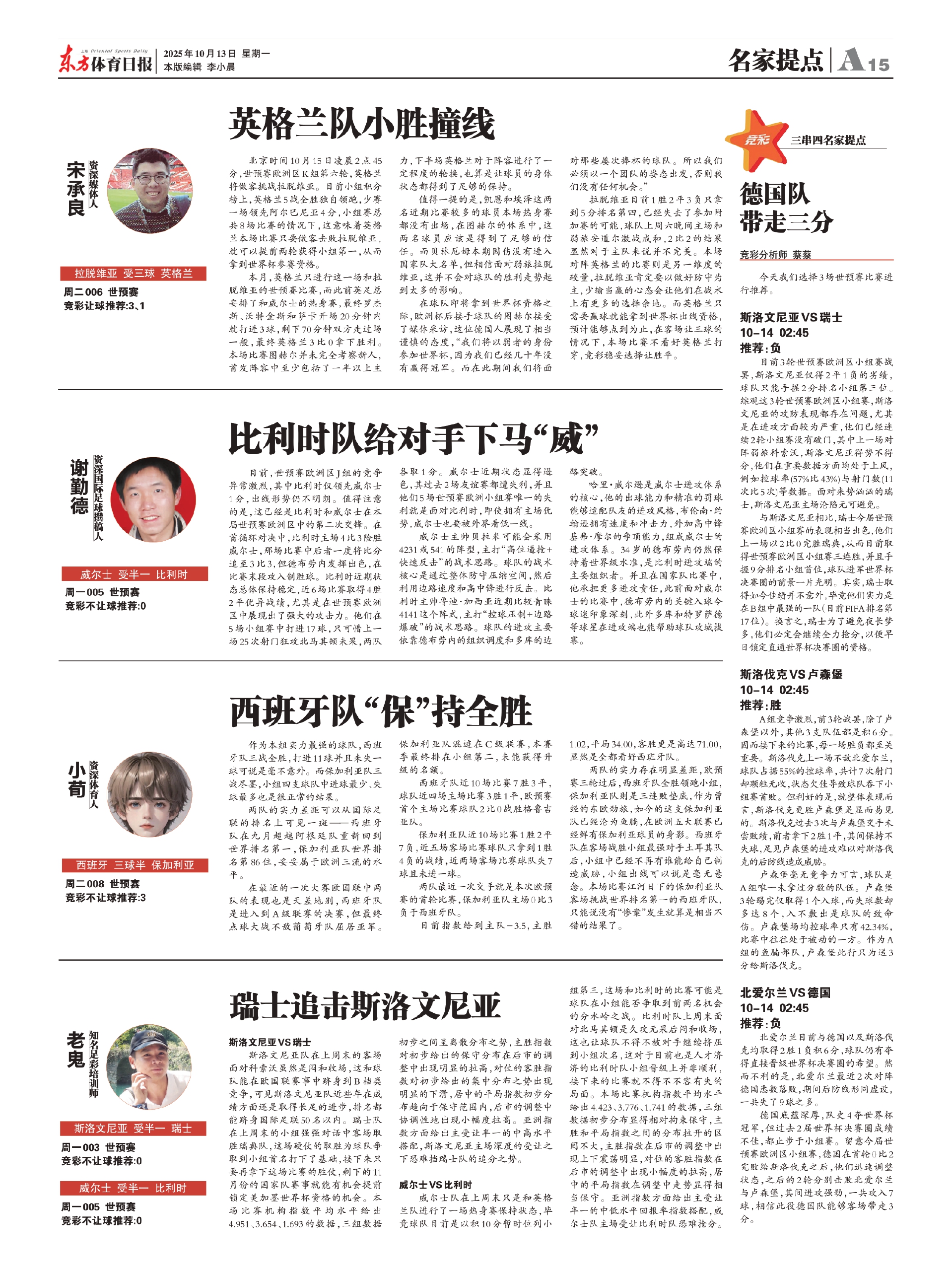 拉脱维亚目前1胜2平3负只拿到5分排名第四,已经失去了参加附加赛的可能,球队上周六晚间主场和弱旅安道尔激战成和,2比2的结果显然对于主队来说并不完美。本场对阵英格兰的比赛则是另一维度的较量,拉脱维亚肯定要以做好防守为主,少输当赢的心态会让他们在战术上有更多的选择余地。而英格兰只需要赢球就能拿到世界杯出线资格,预计能够点到为止,在客场让三球的情况下,本场比赛不看好英格兰打穿,竞彩稳妥选择让胜平。
