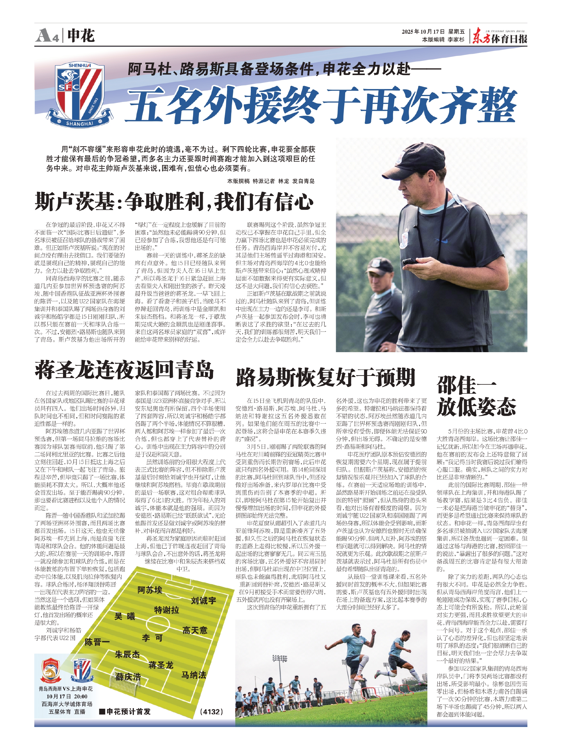同青岛西海岸的比赛之前,随赤道几内亚参加世界杯预选赛的阿苏埃、随中国香港队征战亚洲杯外围赛的陈晋一,以及随U22国家队在海埂集训并和泰国队踢了两场热身赛的刘诚宇和杨皓宇都是15日刚刚归队,所以都只能在赛前一天和球队合练一次。不过,安德烈·路易斯也随队来到了青岛。斯卢茨基为他出场所开的“绿灯”在一定程度上也缓解了目前的困难:“虽然他未必能踢满90分钟,但已经参加了合练,我想他还是有可能出场的。”