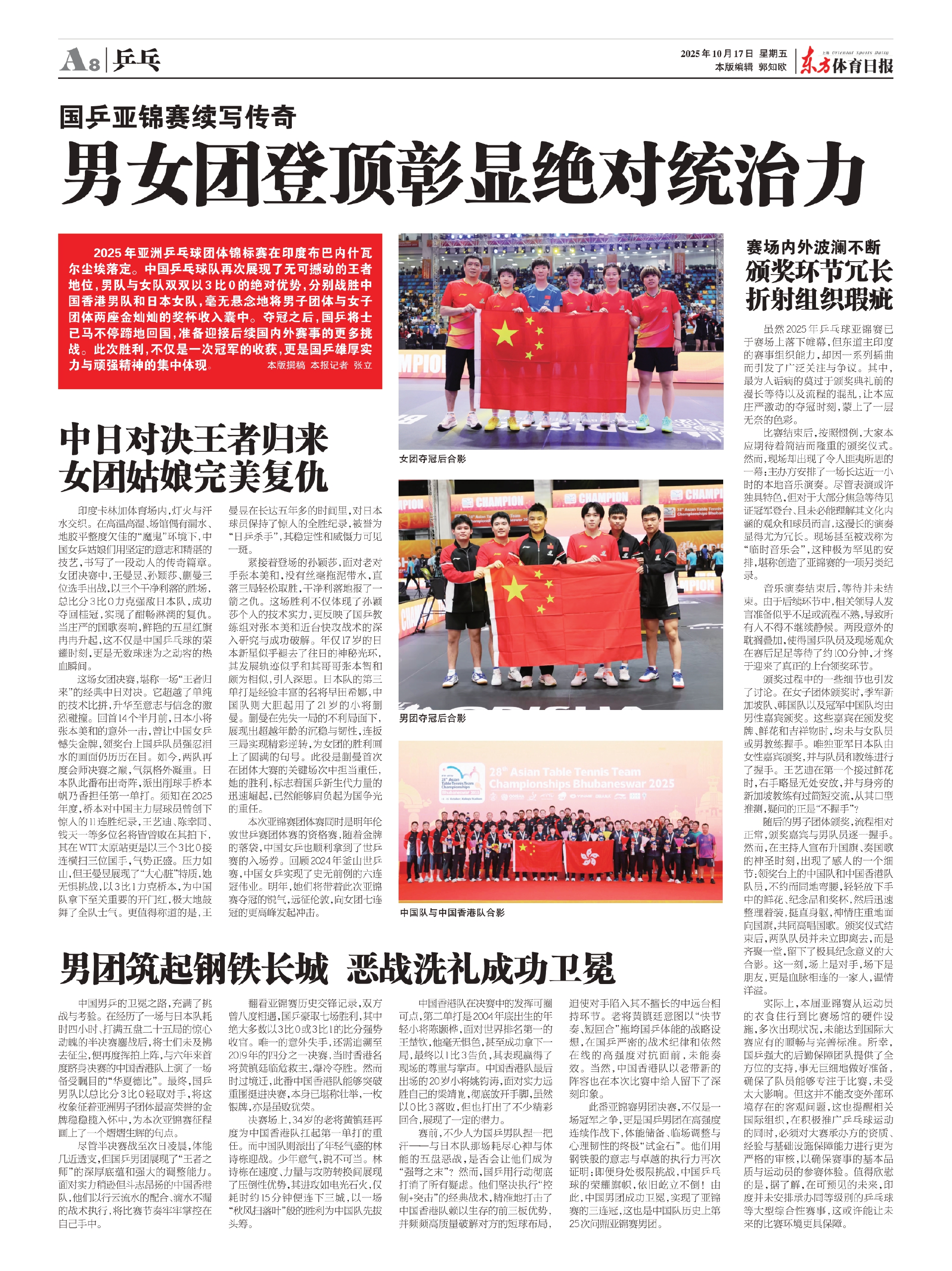 2025年亚洲乒乓球团体锦标赛在印度布巴内什瓦尔尘埃落定。中国乒乓球队再次展现了无可撼动的王者地位,男队与女队双双以3比0的绝对优势,分别战胜中国香港男队和日本女队,毫无悬念地将男子团体与女子团体两座金灿灿的奖杯收入囊中。夺冠之后,国乒将士已马不停蹄地回国,准备迎接后续国内外赛事的更多挑战。此次胜利,不仅是一次冠军的收获,更是国乒雄厚实力与顽强精神的集中体现。