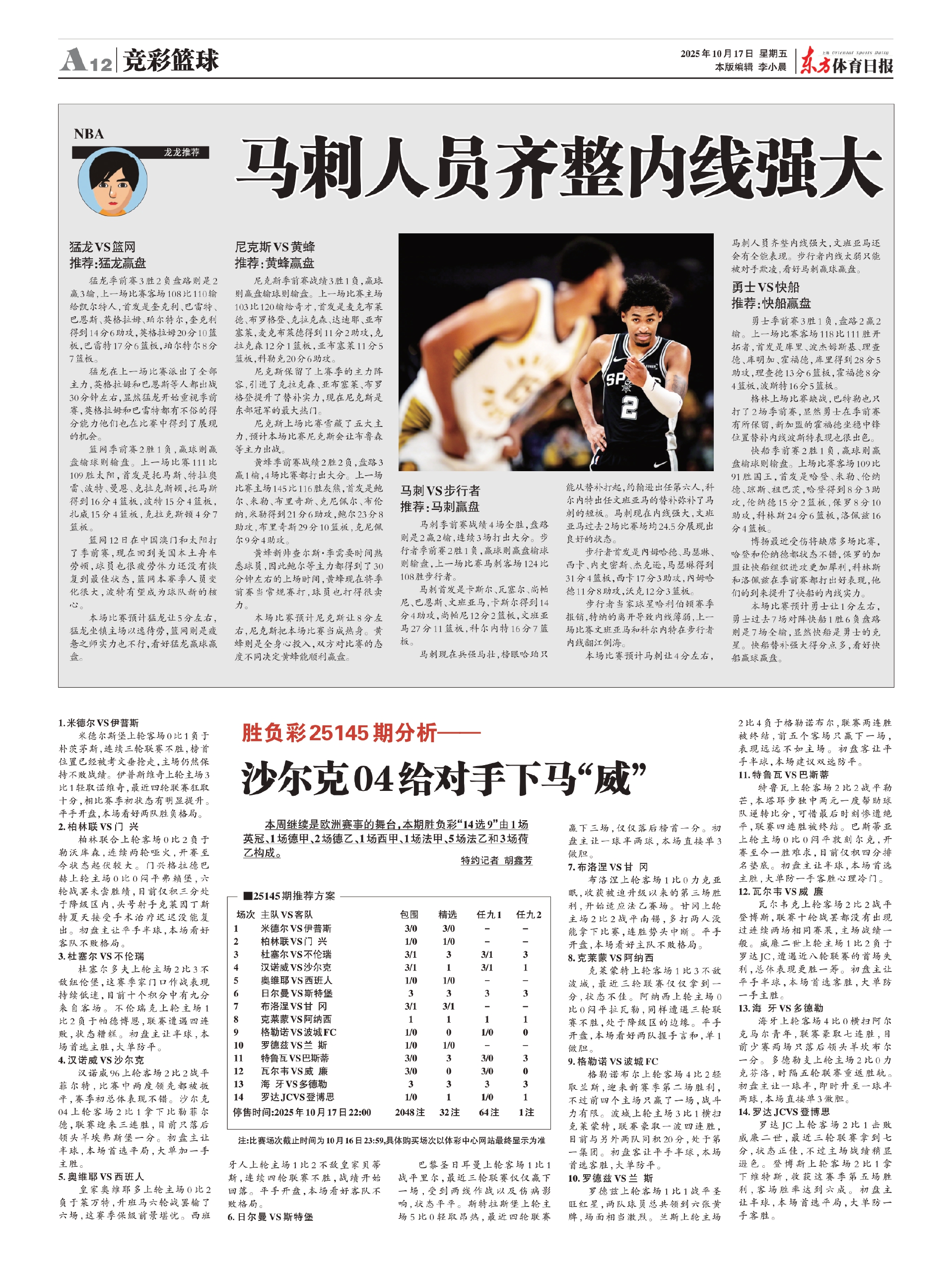 本场比赛预计马刺让4分左右,马刺人员齐整内线强大,文班亚马还会有全能表现。步行者内线太弱只能被对手欺凌,看好马刺赢球赢盘。