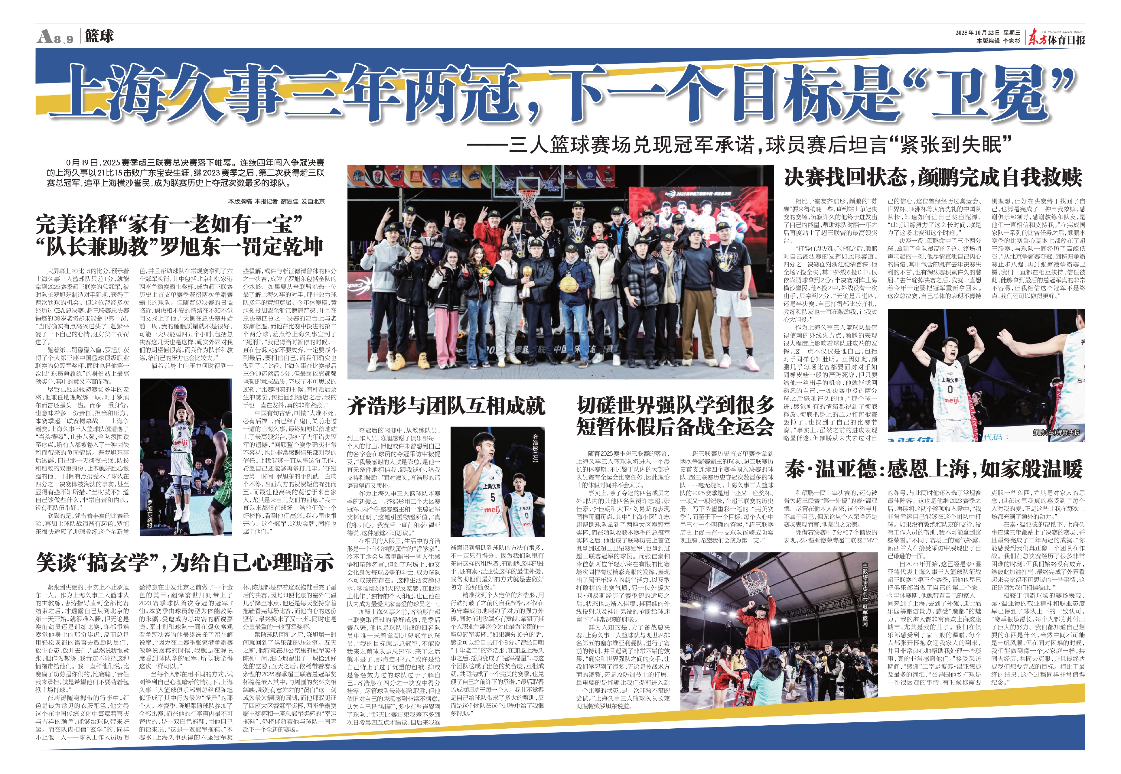 超三联赛历史首支单赛季拿到两次争霸赛霸主的球队、超三联赛历史首支连续四个赛季闯入决赛的球队、超三联赛历史夺冠次数最多的球队……毫无疑问,上海久事三人篮球队的2025赛季是用一座又一座奖杯、一项又一项纪录,在超三联赛的历史册上写下浓墨重彩一笔的 “完美赛季”,而至于下一个目标,每个人心中早已有一个明确的答案,“超三联赛历史上尚未有一支球队能够成功实现卫冕,希望我们会成为第一支。”