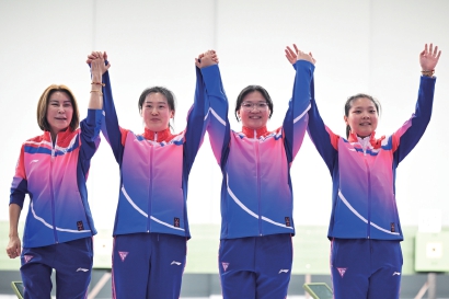 上海队夺得女子10米气手枪团体冠军,姜冉馨、沈奕瑶、张绮和教练员(从右至左)在颁奖仪式上