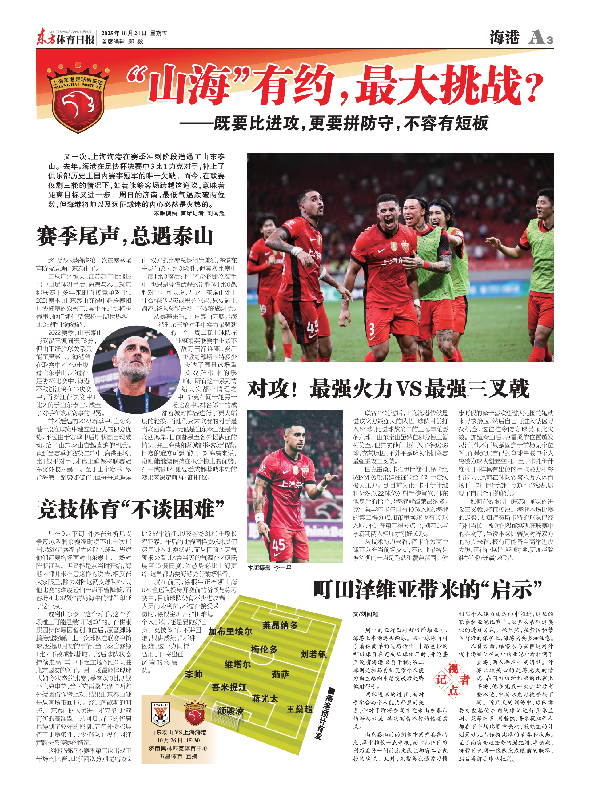 并不遥远的2023赛季中,上海海港一度在联赛中建立起巨大的积分优势,不过由于赛季中后期状态出现波动,给了山东泰山奋起直追的机会。直到当赛季倒数第二轮中,海港主场1比1战平对手,才真正确保将联赛冠军奖杯收入囊中。至于上个赛季,尽管海港一路势如破竹,但每每遭遇泰山,双方的比赛总是相当激烈,海港在主场虽然4比3险胜,但其实比赛中一度1比3落后;下半循环的那次交手中,也只是凭借武磊的制胜球1比0战胜对手。可以说,无论山东泰山处于什么样的状态或积分位置,只要碰上海港,该队总能迸发出不错的战斗力。