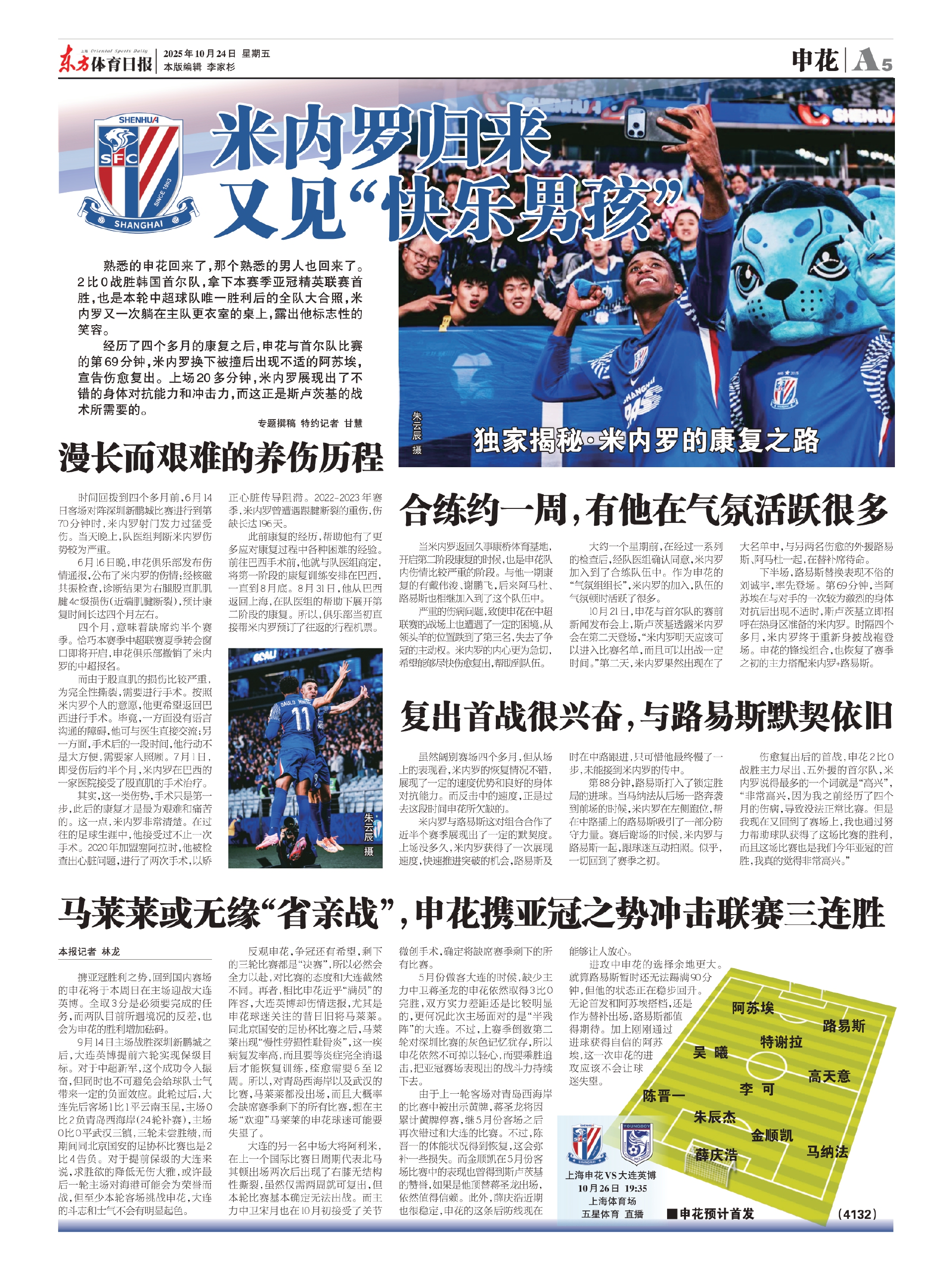 熟悉的申花回来了,那个熟悉的男人也回来了。2比0战胜韩国首尔队,拿下本赛季亚冠精英联赛首胜,也是本轮中超球队唯一胜利后的全队大合照,米内罗又一次躺在主队更衣室的桌上,露出他标志性的笑容。