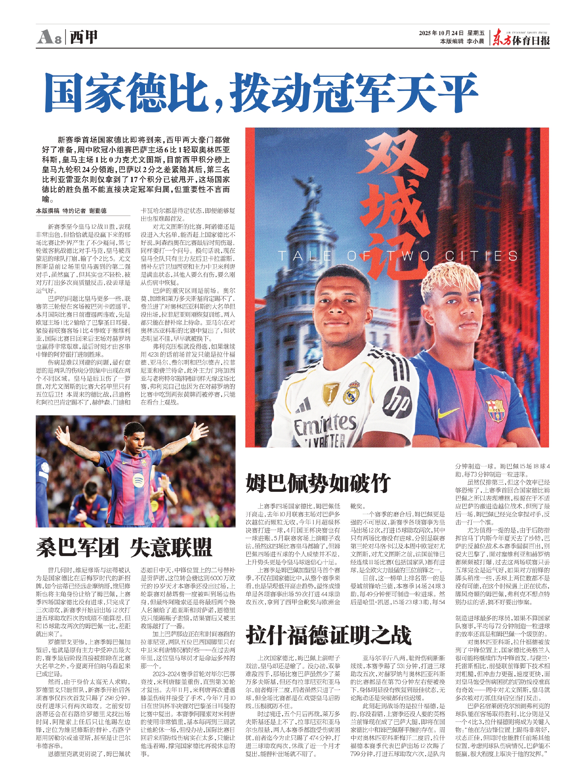 曾几何时,维尼修斯与法蒂被认为是国家德比在后梅罗时代的新招牌,如今法蒂已经远走摩纳哥,维尼修斯也将主角身份让给了姆巴佩,上赛季四场国家德比没有进球,只完成了三次助攻,新赛季开始后出场12次打进五球助攻四次的成绩不能算差,但和15球助攻两次的姆巴佩一比,差距就出来了。
