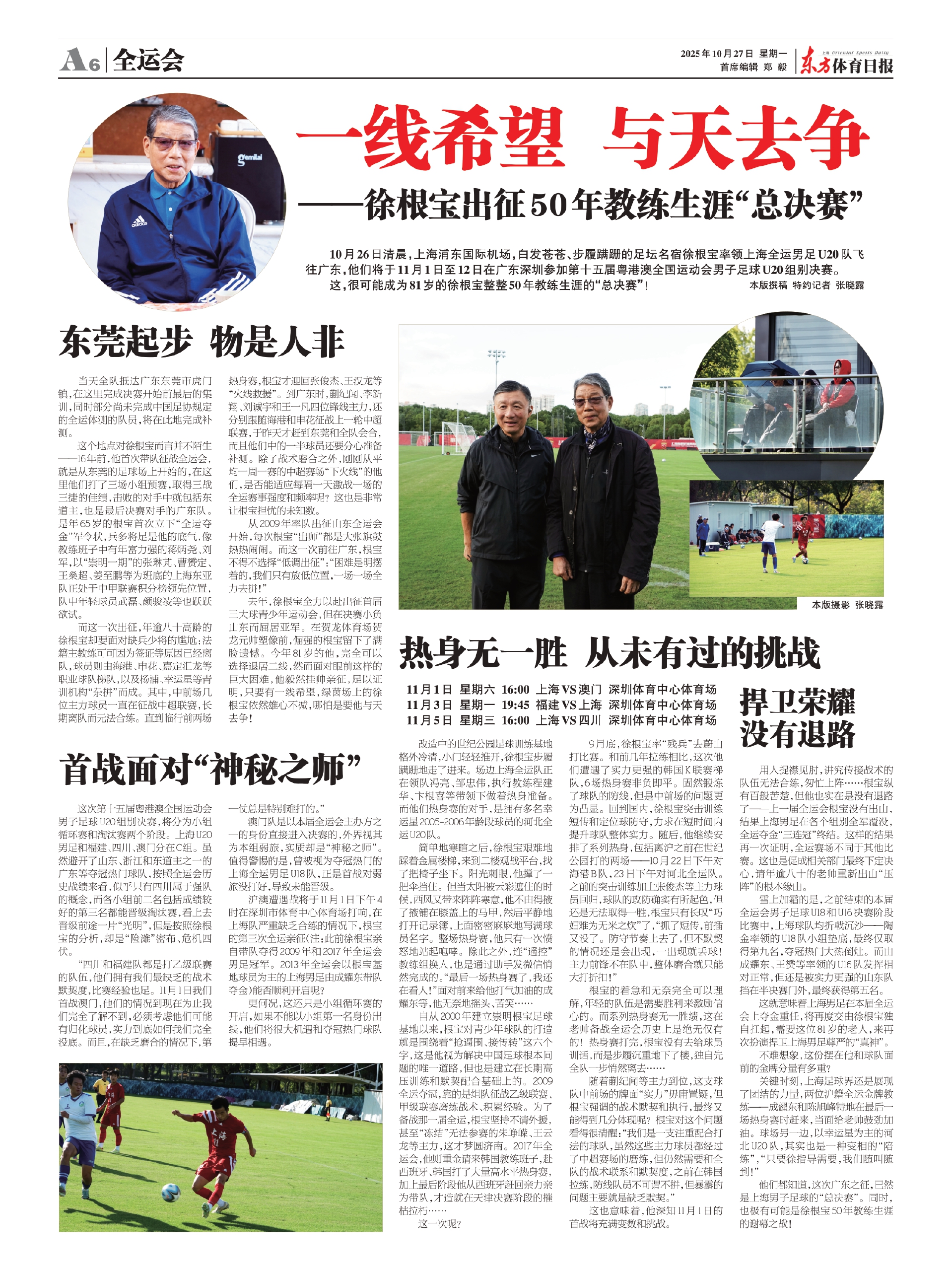 10月26日清晨,上海浦东国际机场,白发苍苍、步履蹒跚的足坛名宿徐根宝率领上海全运男足U20队飞往广东,他们将于11月1日至12日在广东深圳参加第十五届粤港澳全国运动会男子足球U20组别决赛。