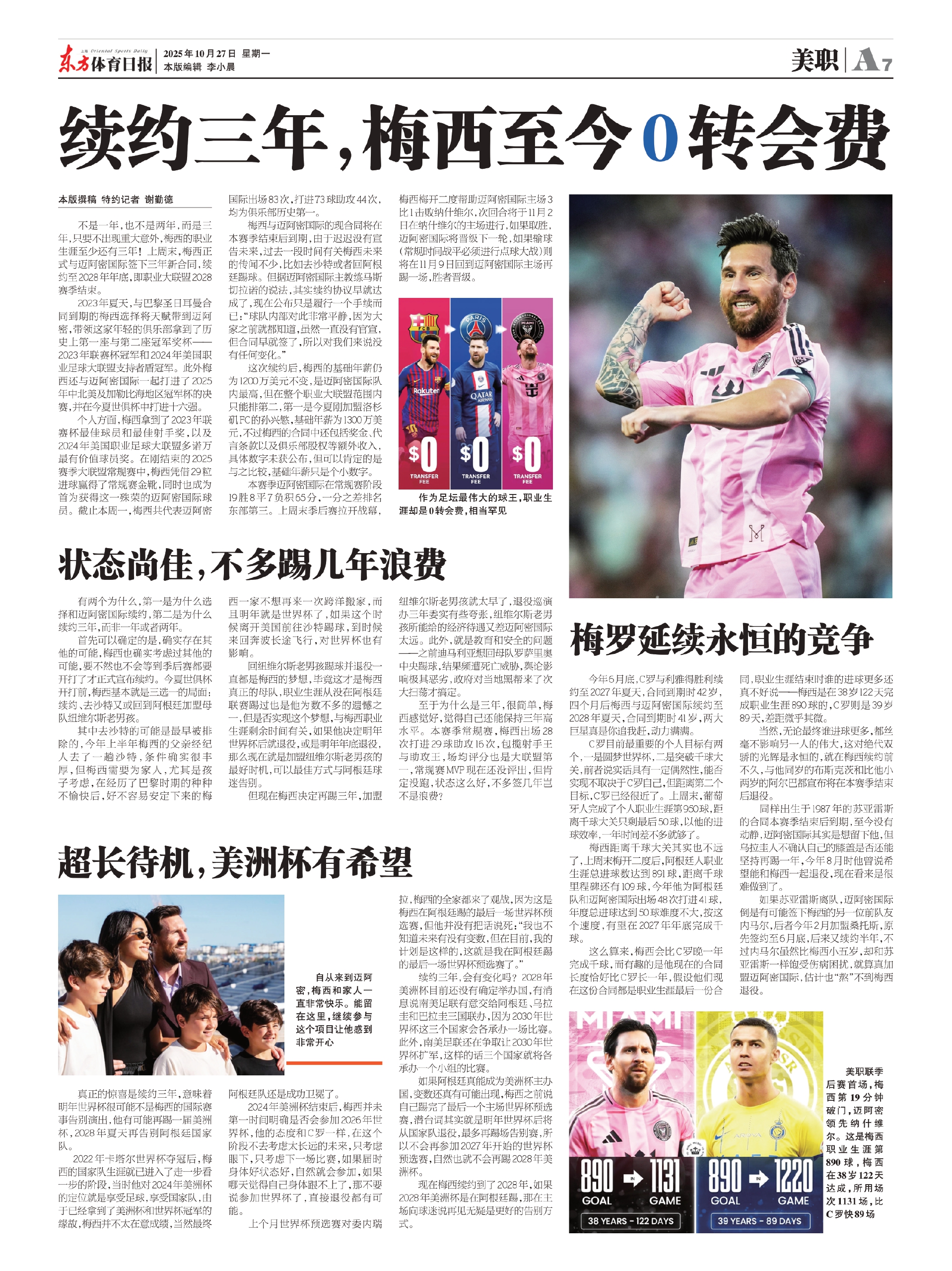 今年6月底,C罗与利雅得胜利续约至2027年夏天,合同到期时42岁,四个月后梅西与迈阿密国际续约至2028年夏天,合同到期时41岁,两大巨星真是你追我赶,动力满满。