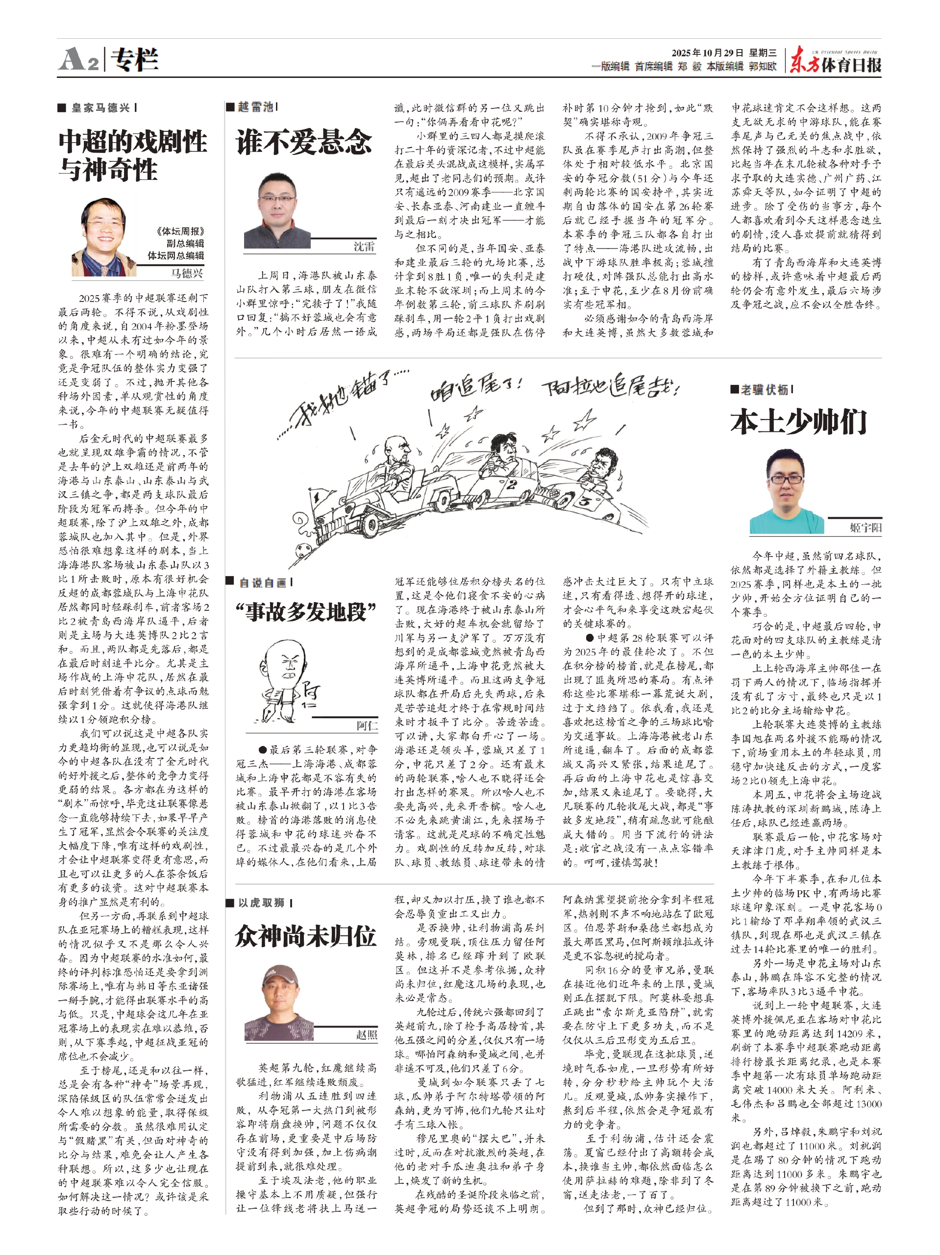 后金元时代的中超联赛最多也就呈现双雄争霸的情况,不管是去年的沪上双雄还是前两年的海港与山东泰山、山东泰山与武汉三镇之争,都是两支球队最后阶段为冠军而搏杀。但今年的中超联赛,除了沪上双雄之外,成都蓉城队也加入其中。但是,外界恐怕很难想象这样的剧本,当上海海港队客场被山东泰山队以3比1所击败时,原本有很好机会反超的成都蓉城队与上海申花队居然都同时轻踩刹车,前者客场2比2被青岛西海岸队逼平,后者则是主场与大连英博队2比2言和。而且,两队都是先落后,都是在最后时刻追平比分。尤其是主场作战的上海申花队,居然在最后时刻凭借着有争议的点球而勉强拿到1分。这就使得海港队继续以1分领跑积分榜。