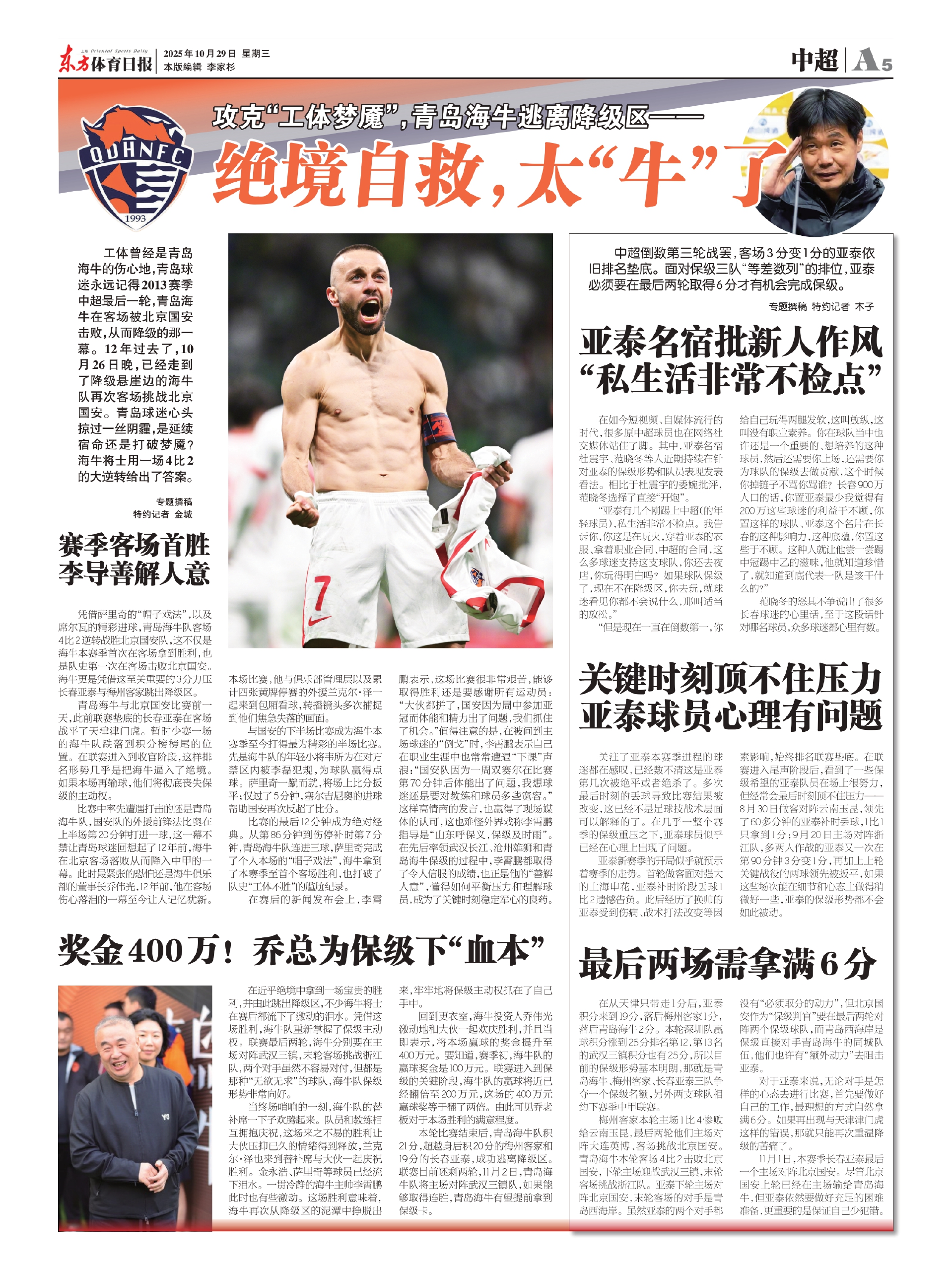 本轮比赛结束后,青岛海牛队积21分,超越身后积20分的梅州客家和19分的长春亚泰,成功逃离降级区。联赛目前还剩两轮,11月2日,青岛海牛队将主场对阵武汉三镇队,如果能够取得连胜,青岛海牛有望提前拿到保级卡。