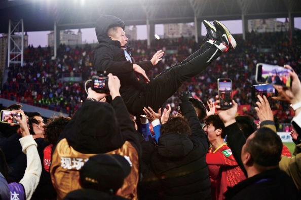 李金羽:是就要实现冲超目标之前的这段时间。越到快成功的时候,比赛情况特别复杂。我们一度一负两平三轮不胜,那段时间心情很忐忑、很难熬。我们总跟自己说“行百里者半九十”,都到赛点了,真怕掉队。那天终场哨声响起的时候,终于如释重负,内心其实挺平静的。