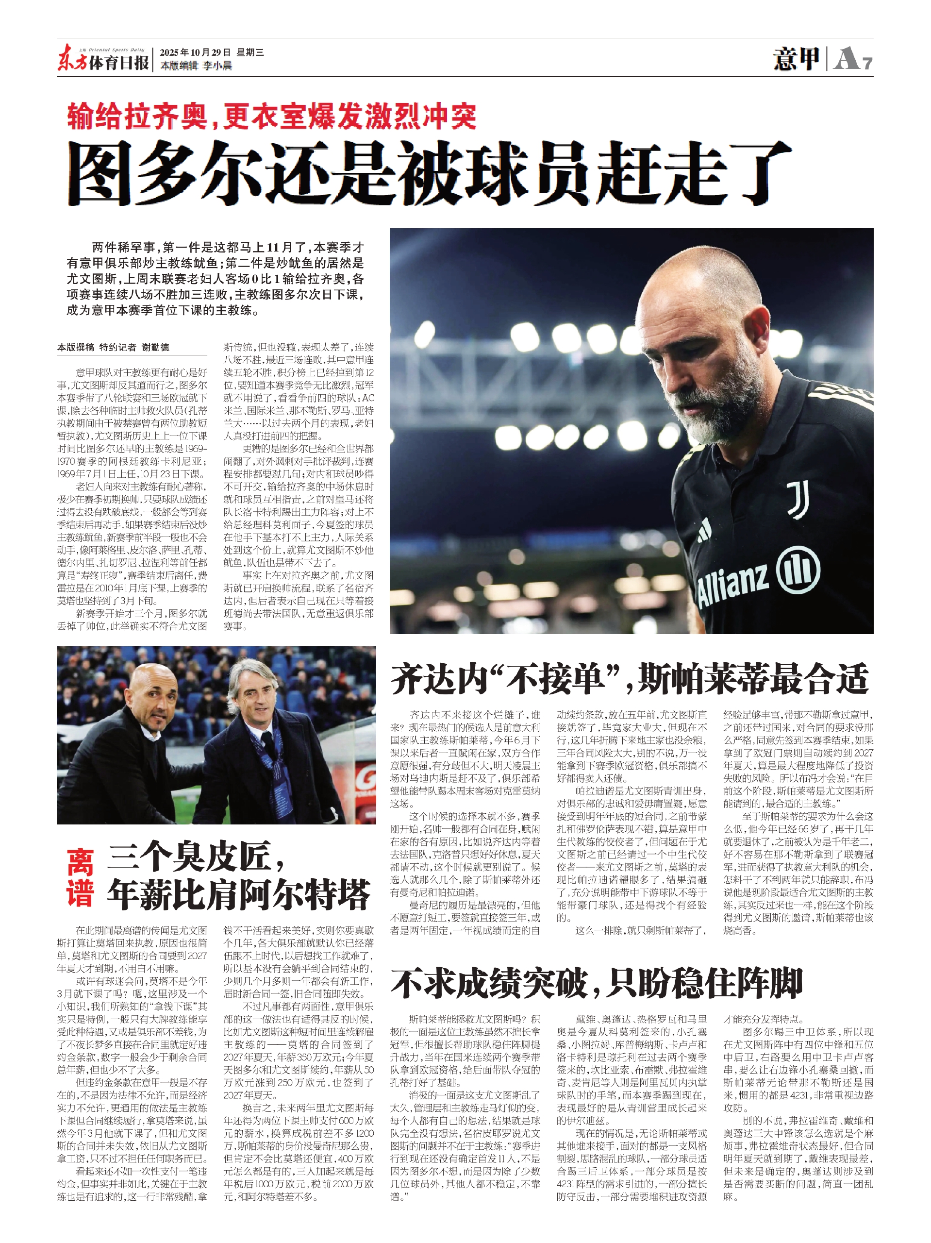 更糟的是图多尔已经和全世界都闹翻了,对外讽刺对手批评裁判,连赛程安排都要怼几句;对内和球员吵得不可开交,输给拉齐奥的中场休息时就和球员互相指责,之前对皇马还将队长洛卡特利踢出主力阵容;对上不给总经理科莫利面子,今夏签的球员在他手下基本打不上主力,人际关系处到这个份上,就算尤文图斯不炒他鱿鱼,队伍也是带不下去了。