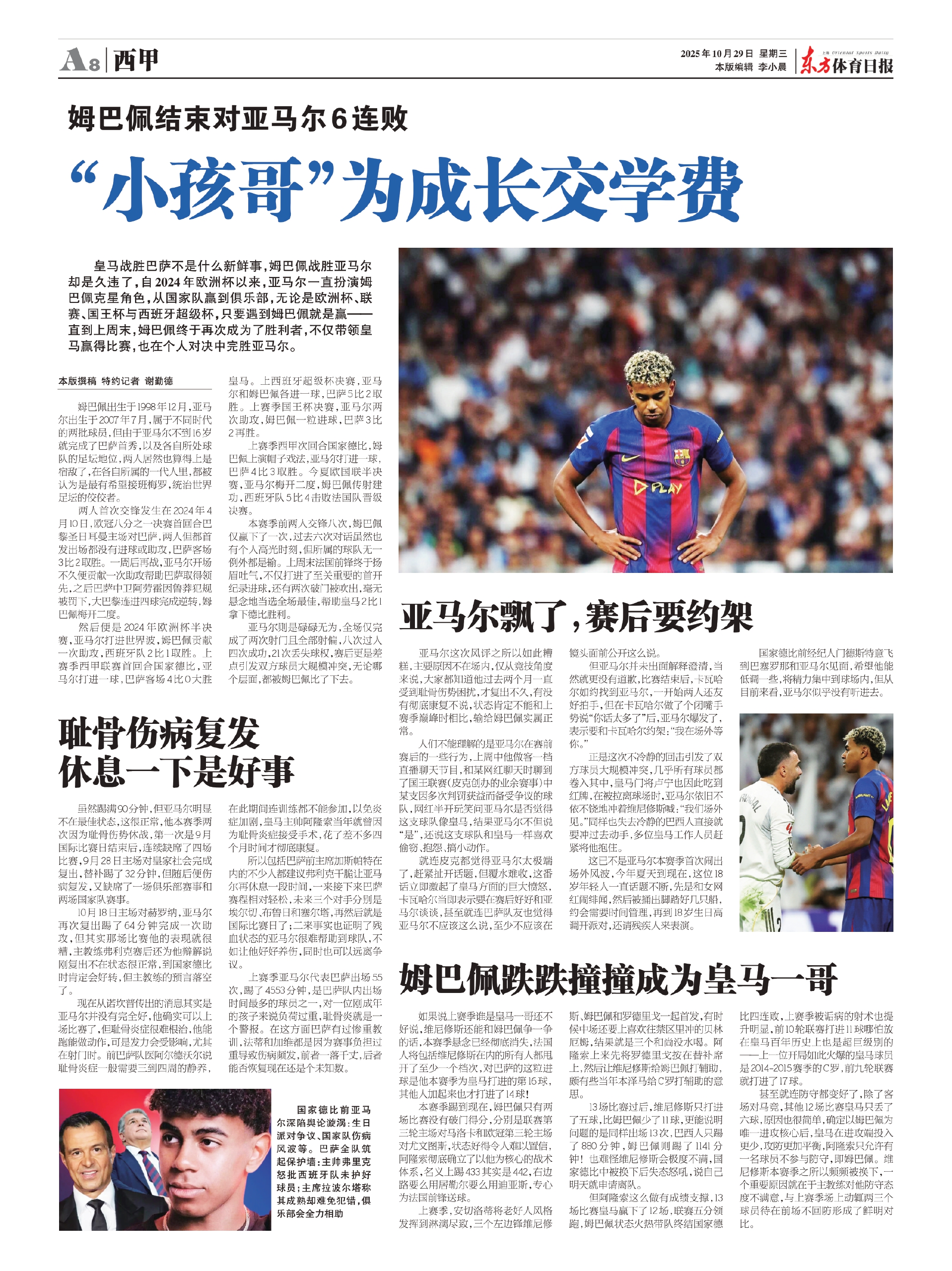 国家德比前亚马尔深陷舆论漩涡:生日派对争议、国家队伤病风波等。巴萨全队筑起保护墙:主帅弗里克怒批西班牙队未护好球员;主席拉波尔塔称其成熟却难免犯错,俱乐部会全力相助
