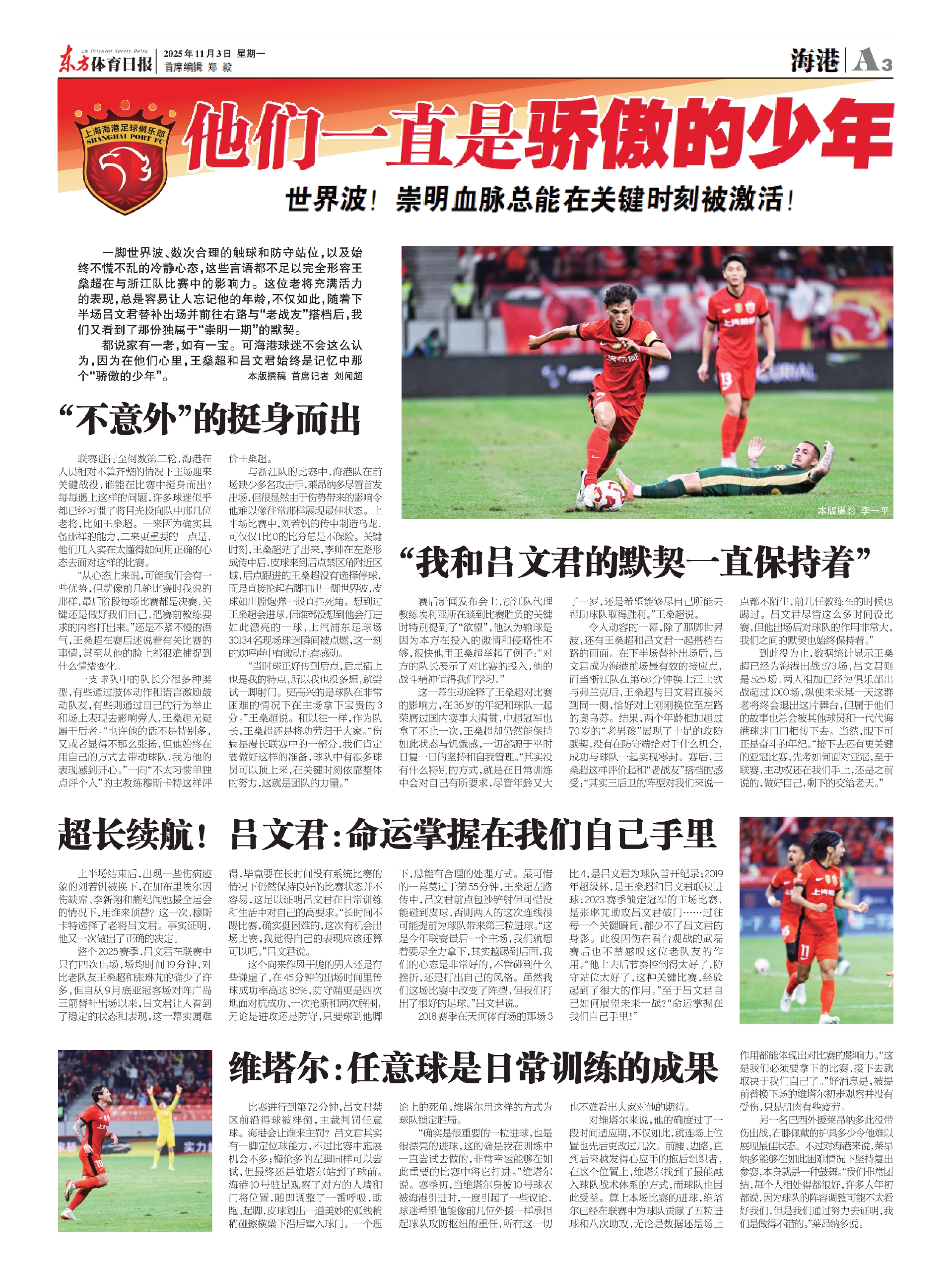 令人动容的一幕,除了那脚世界波,还有王燊超和吕文君一起搭档右路的画面。在下半场替补出场后,吕文君成为海港前场最有效的接应点,而当浙江队在第68分钟换上汪士钦与弗兰克后,王燊超与吕文君直接来到同一侧,恰好对上刚刚换位至左路的奥乌苏。结果,两个年龄相加超过70岁的“老男孩”展现了十足的攻防默契,没有在防守端给对手什么机会,成功与球队一起实现零封。赛后,王燊超这样评价起和“老战友”搭档的感受:“其实三后卫的阵型对我们来说一点都不陌生,前几任教练在的时候也踢过。吕文君尽管这么多时间没比赛,但他出场后对球队的作用非常大,我们之间的默契也始终保持着。”