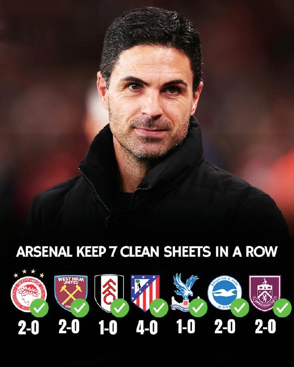 阿尔特塔的球队目前已经在各项赛事豪取九连胜,连续7场比赛实现零封。在英格兰联赛杯和欧冠联赛共五场比赛里全部保持零封。