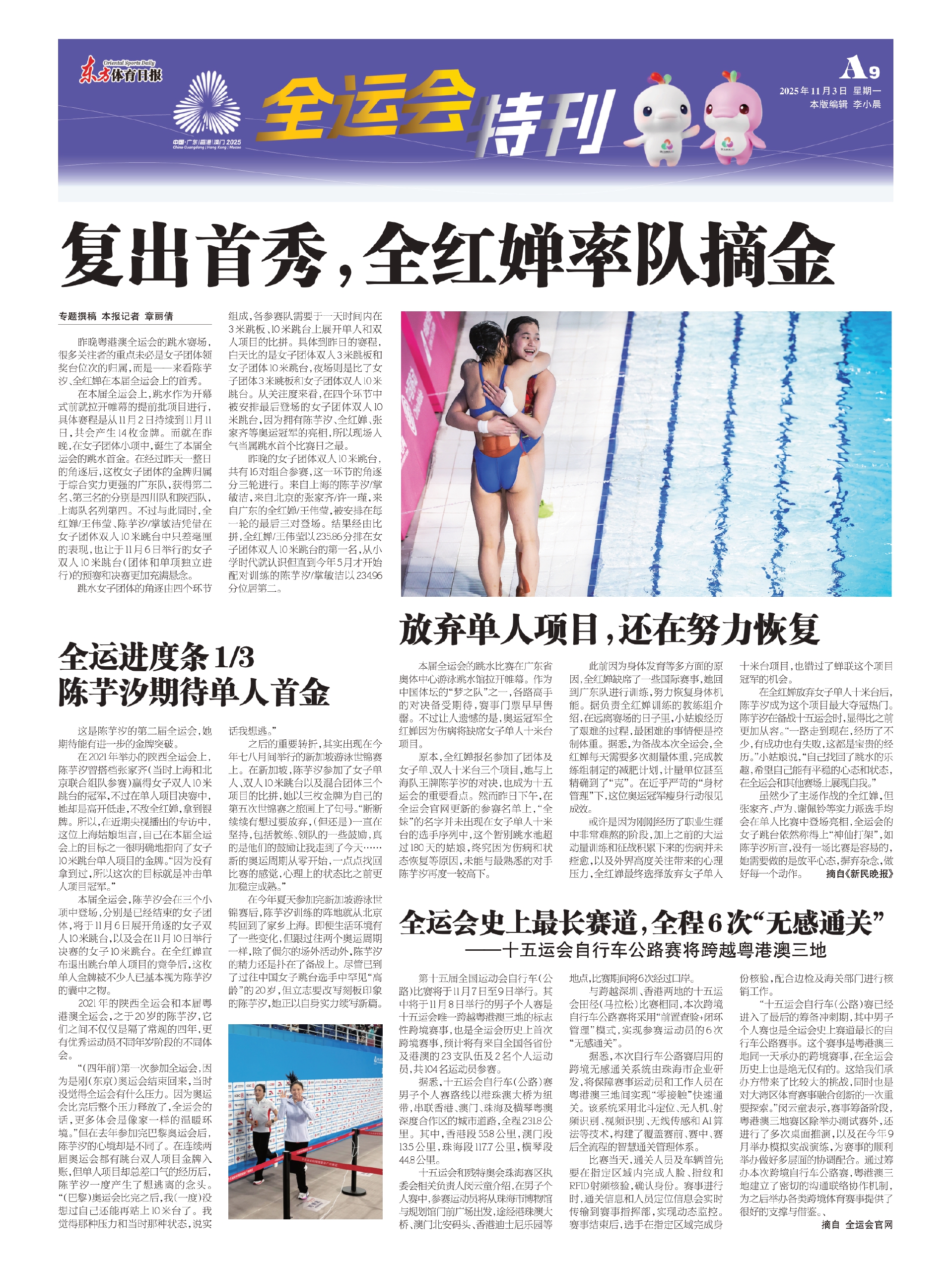 在本届全运会上,跳水作为开幕式前就拉开帷幕的提前批项目进行,具体赛程是从11月2日持续到11月11日,共会产生14枚金牌。而就在昨晚,在女子团体小项中,诞生了本届全运会的跳水首金。在经过昨天一整日的角逐后,这枚女子团体的金牌归属于综合实力更强的广东队,获得第二名、第三名的分别是四川队和陕西队,上海队名列第四。不过与此同时,全红婵/王伟莹、陈芋汐/掌敏洁凭借在女子团体双人10米跳台中只差毫厘的表现,也让于11月6日举行的女子双人10米跳台(团体和单项独立进行)的预赛和决赛更加充满悬念。