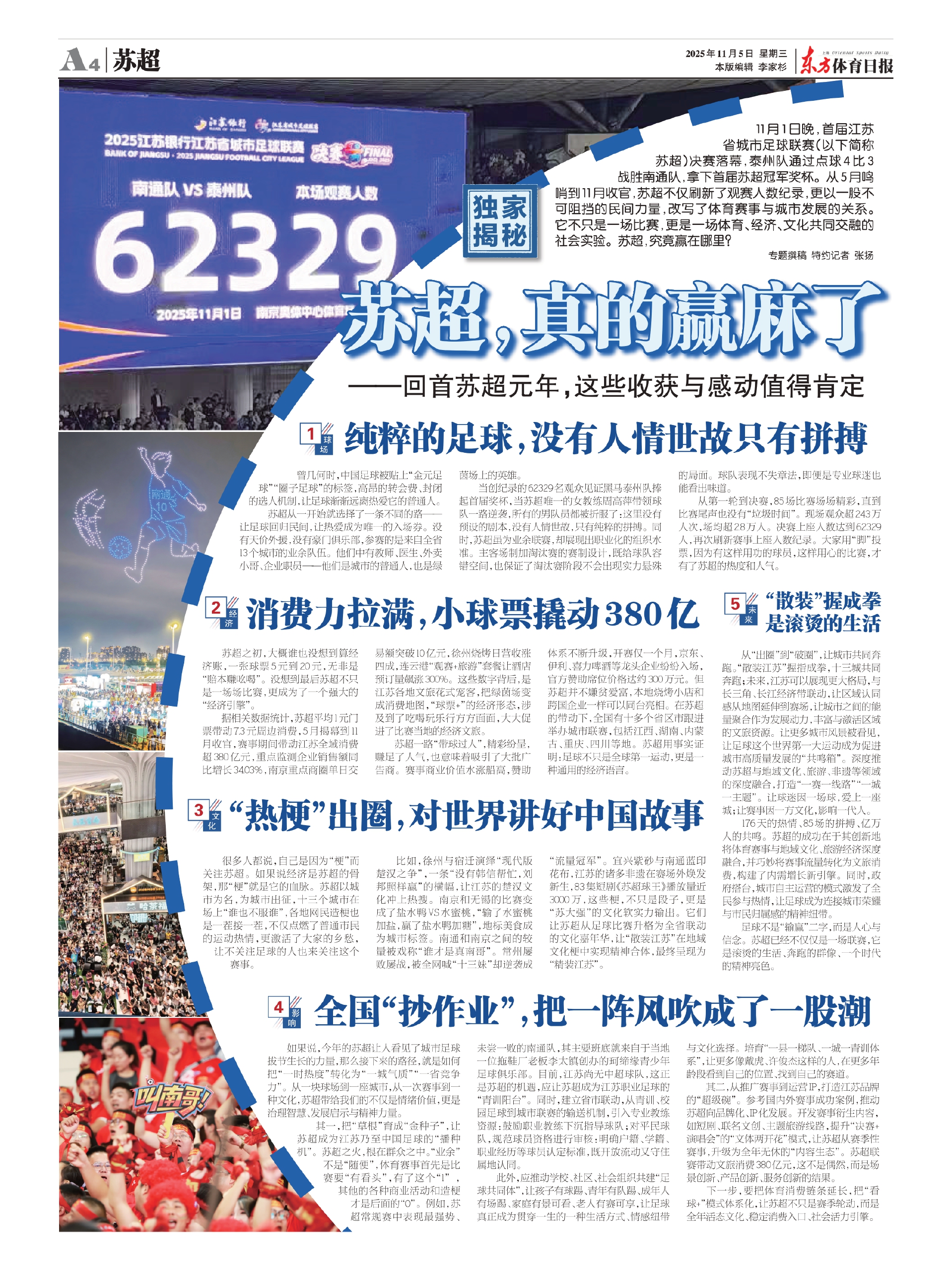 如果说,今年的苏超让人看见了城市足球拔节生长的力量,那么接下来的路径,就是如何把“一时热度”转化为“一城气质”“一省竞争力”。从一块球场到一座城市,从一次赛事到一种文化,苏超带给我们的不仅是情绪价值,更是治理智慧、发展启示与精神力量。