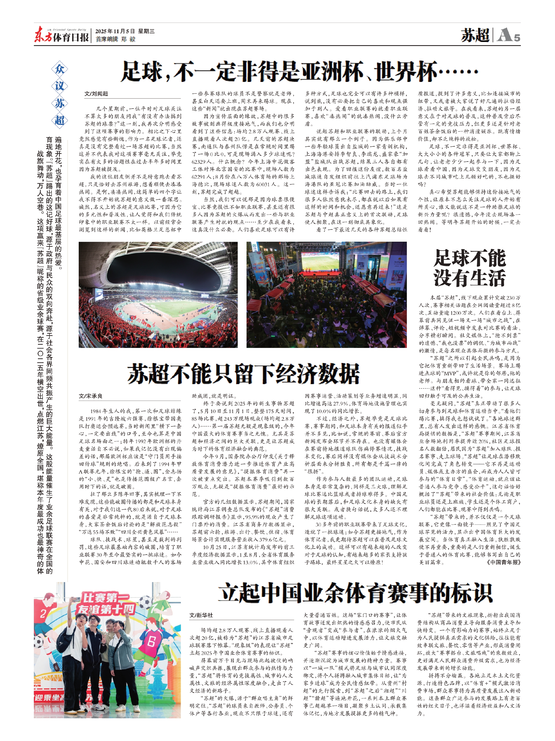当然,我们可以说那是因为球票很便宜、比赛竞技性不如职业联赛,甚至还有很多人因为苏超的火爆从而发出一些与职业联赛产生对抗的观点……至少在我看来,这真没什么必要。人们喜欢足球可以有许多种方式,足球也完全可以有许多种模样,说到底,没有必要把自己的喜欢和观点强加于别人。爱看职业联赛的就看职业联赛,喜欢“凑热闹”的就凑热闹,没什么矛盾。