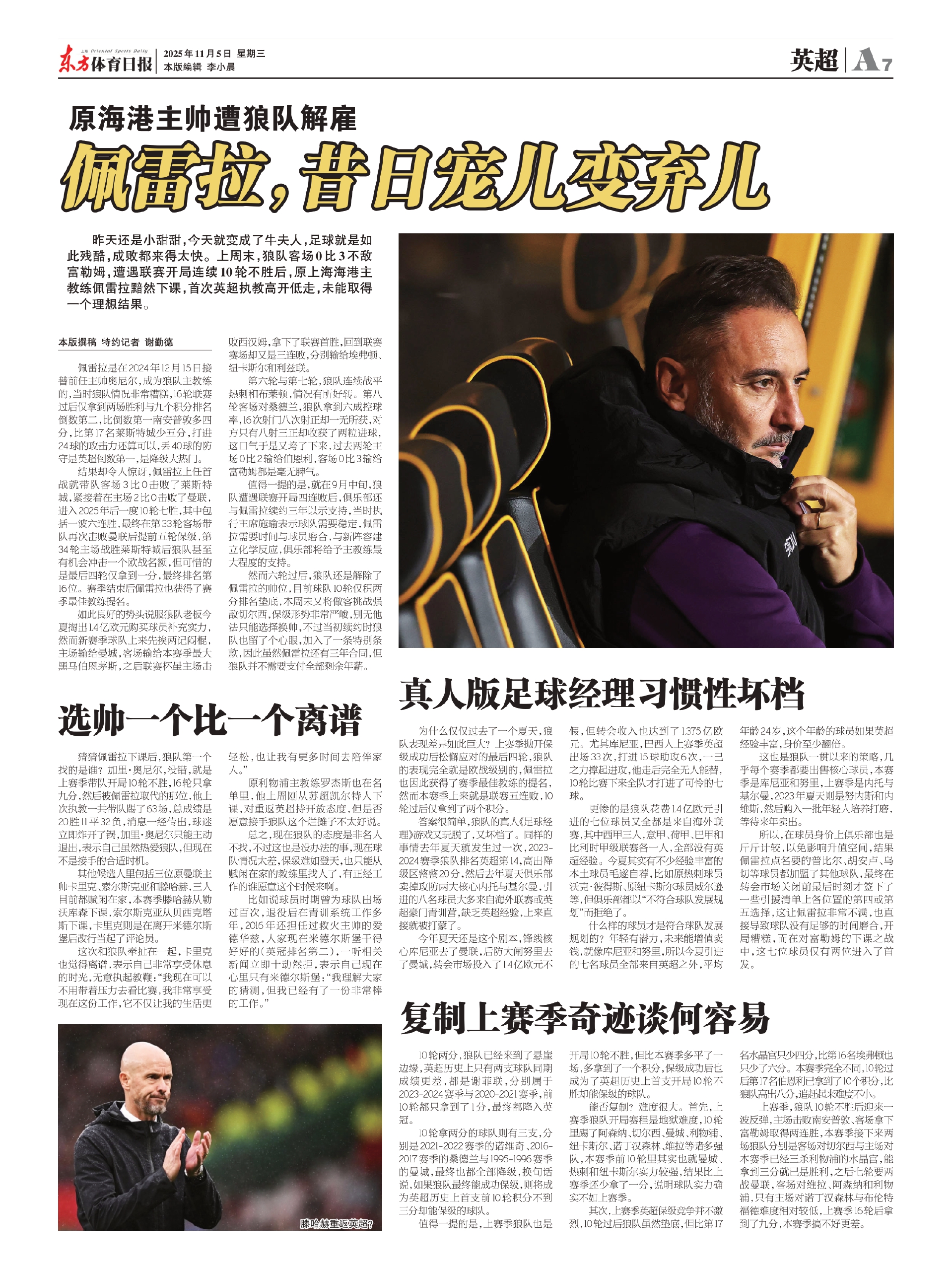 昨天还是小甜甜,今天就变成了牛夫人,足球就是如此残酷,成败都来得太快。上周末,狼队客场0比3不敌富勒姆,遭遇联赛开局连续10轮不胜后,原上海海港主教练佩雷拉黯然下课,首次英超执教高开低走,未能取得一个理想结果。