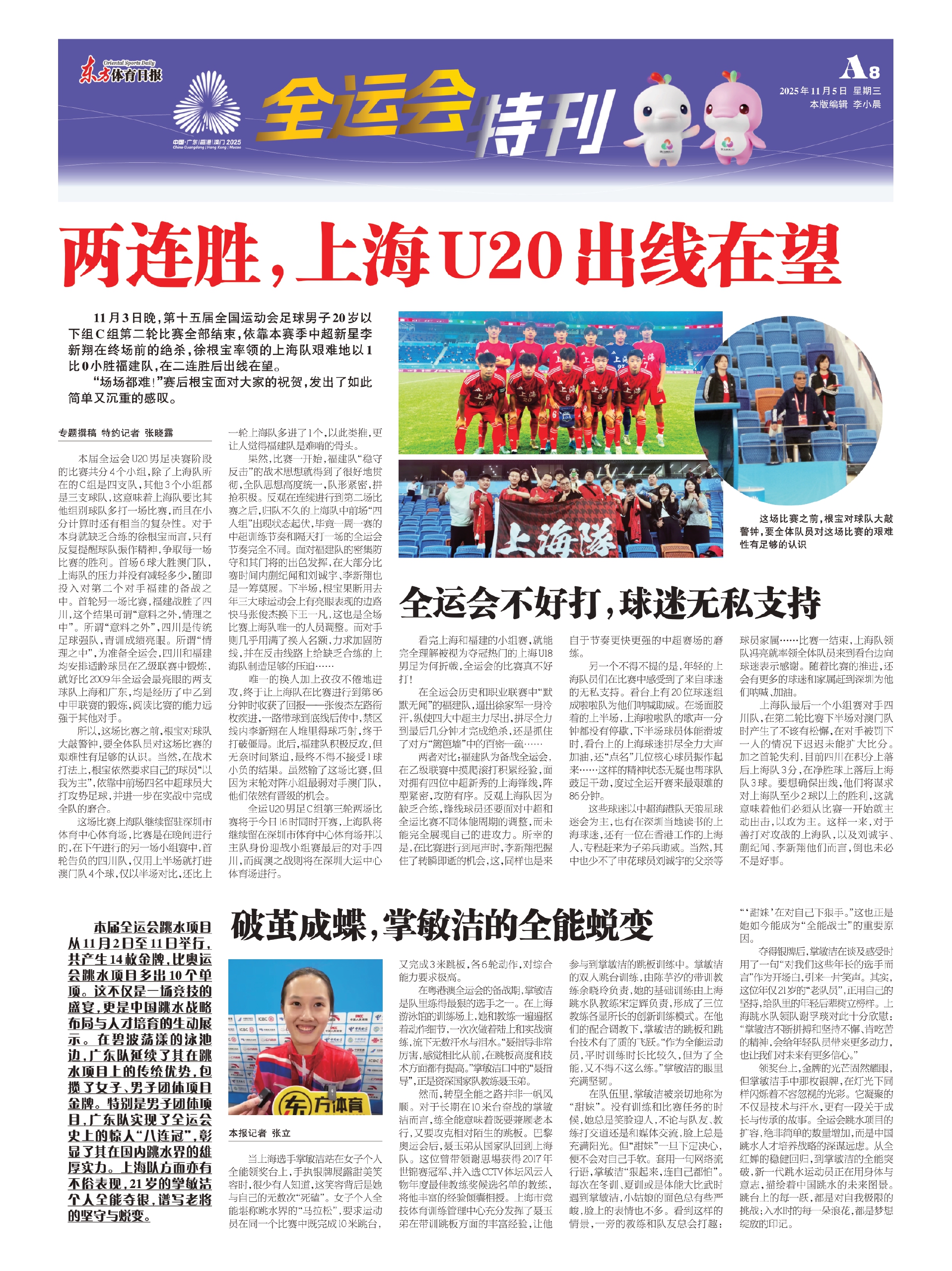 11月3日晚,第十五届全国运动会足球男子20岁以下组C组第二轮比赛全部结束,依靠本赛季中超新星李新翔在终场前的绝杀,徐根宝率领的上海队艰难地以1比0小胜福建队,在二连胜后出线在望。