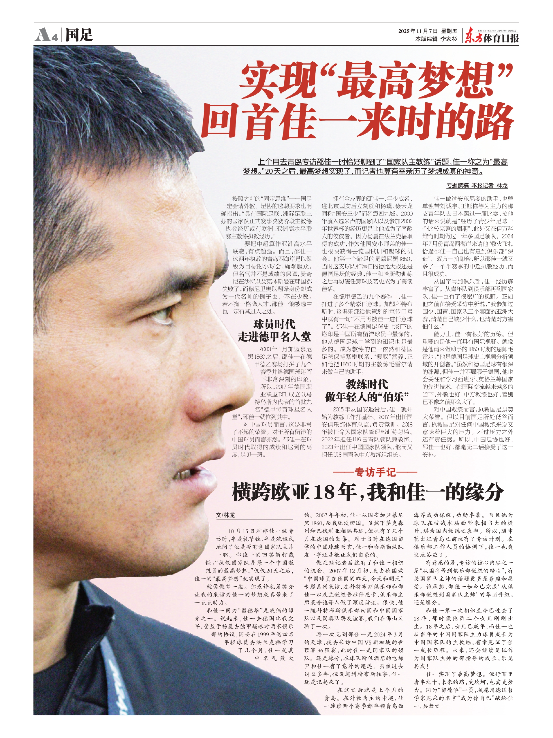 上个月去青岛专访邵佳一时恰好聊到了“国家队主教练”话题,佳一称之为“最高梦想。”20天之后,最高梦想实现了,而记者也算有幸亲历了梦想成真的神奇。