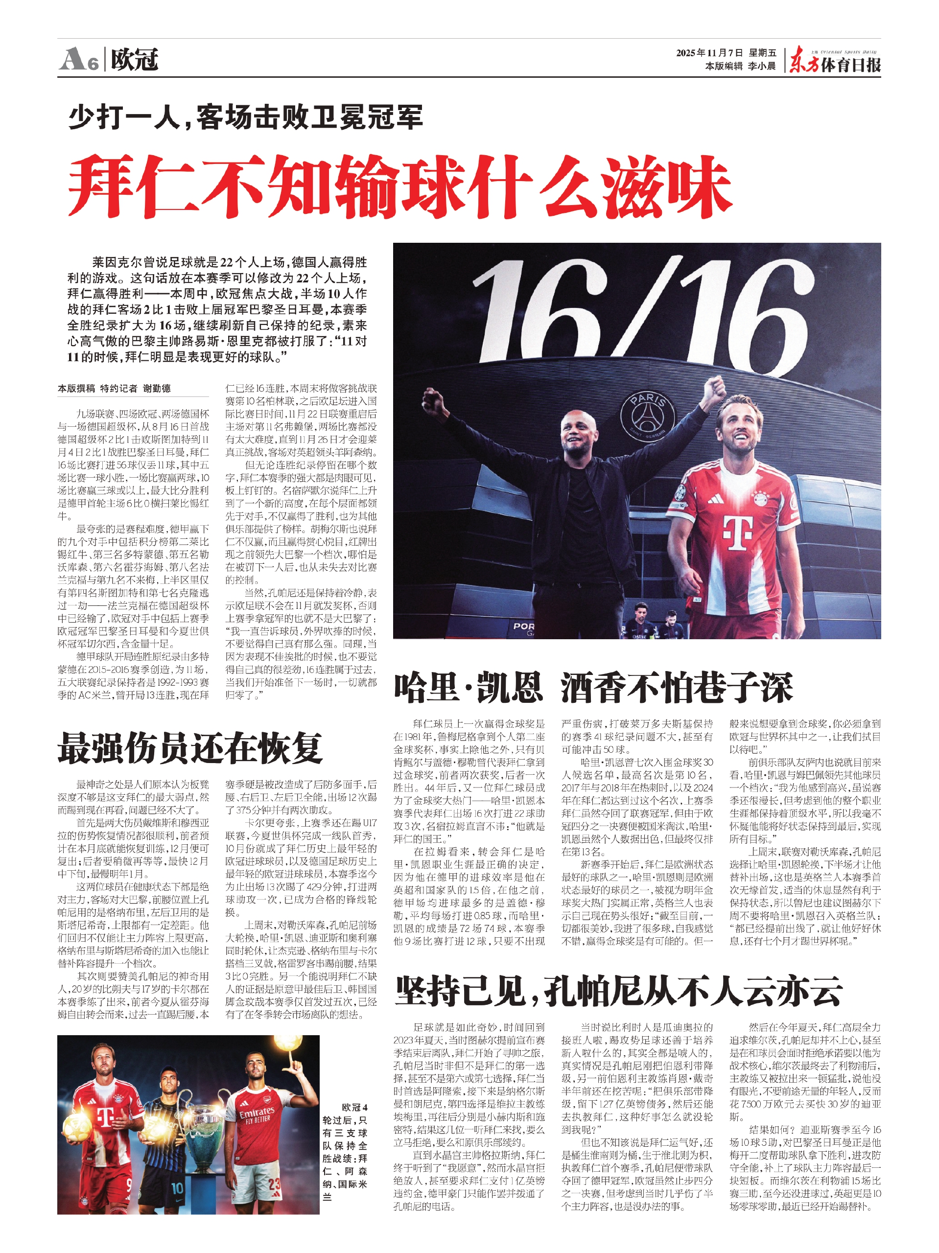 莱因克尔曾说足球就是22个人上场,德国人赢得胜利的游戏。这句话放在本赛季可以修改为22个人上场,拜仁赢得胜利——本周中,欧冠焦点大战,半场10人作战的拜仁客场2比1击败上届冠军巴黎圣日耳曼,本赛季全胜纪录扩大为16场,继续刷新自己保持的纪录,素来心高气傲的巴黎主帅路易斯·恩里克都被打服了:“11对11的时候,拜仁明显是表现更好的球队。”