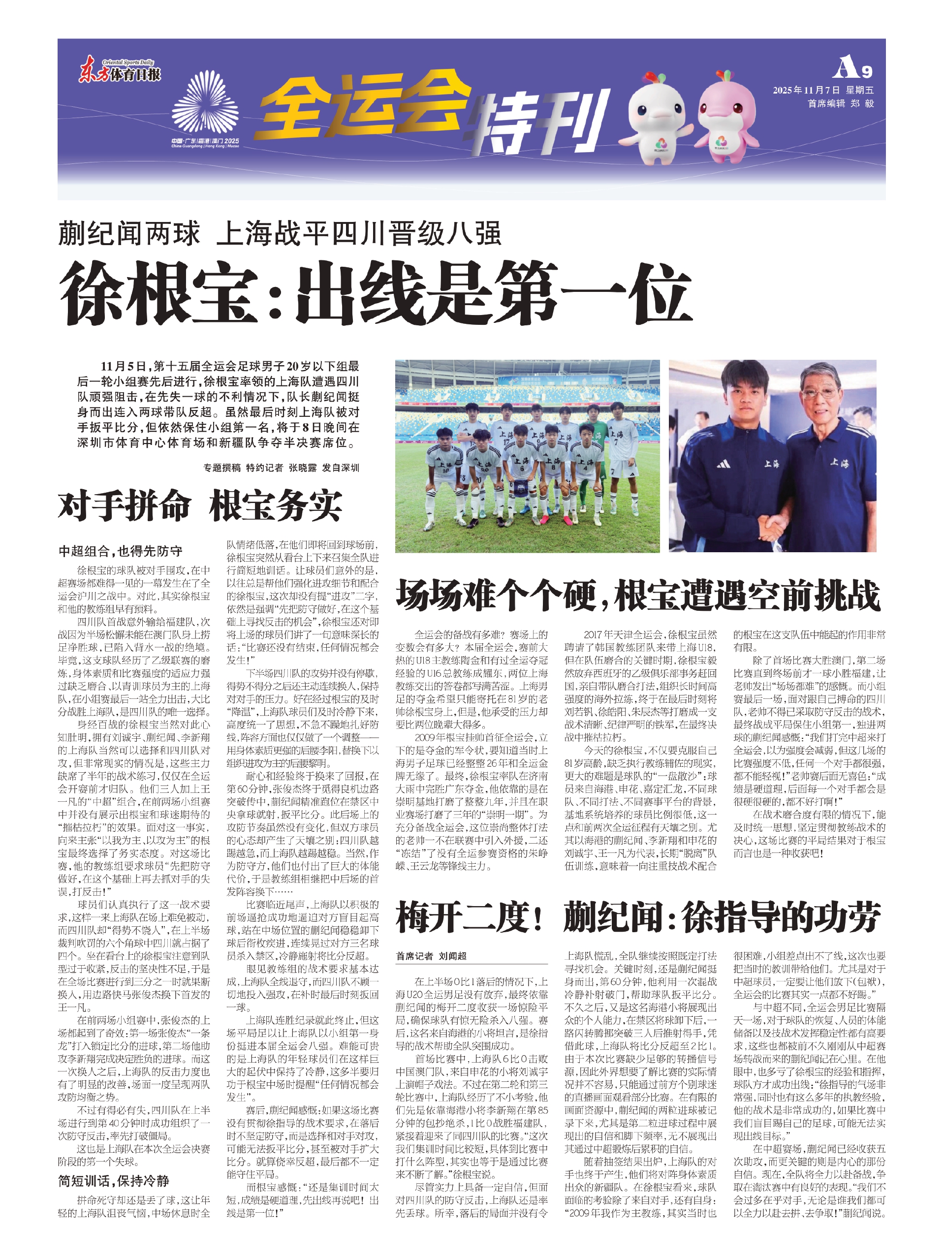 11月5日,第十五届全运会足球男子20岁以下组最后一轮小组赛先后进行,徐根宝率领的上海队遭遇四川队顽强阻击,在先失一球的不利情况下,队长蒯纪闻挺身而出连入两球带队反超。虽然最后时刻上海队被对手扳平比分,但依然保住小组第一名,将于8日晚间在深圳市体育中心体育场和新疆队争夺半决赛席位。