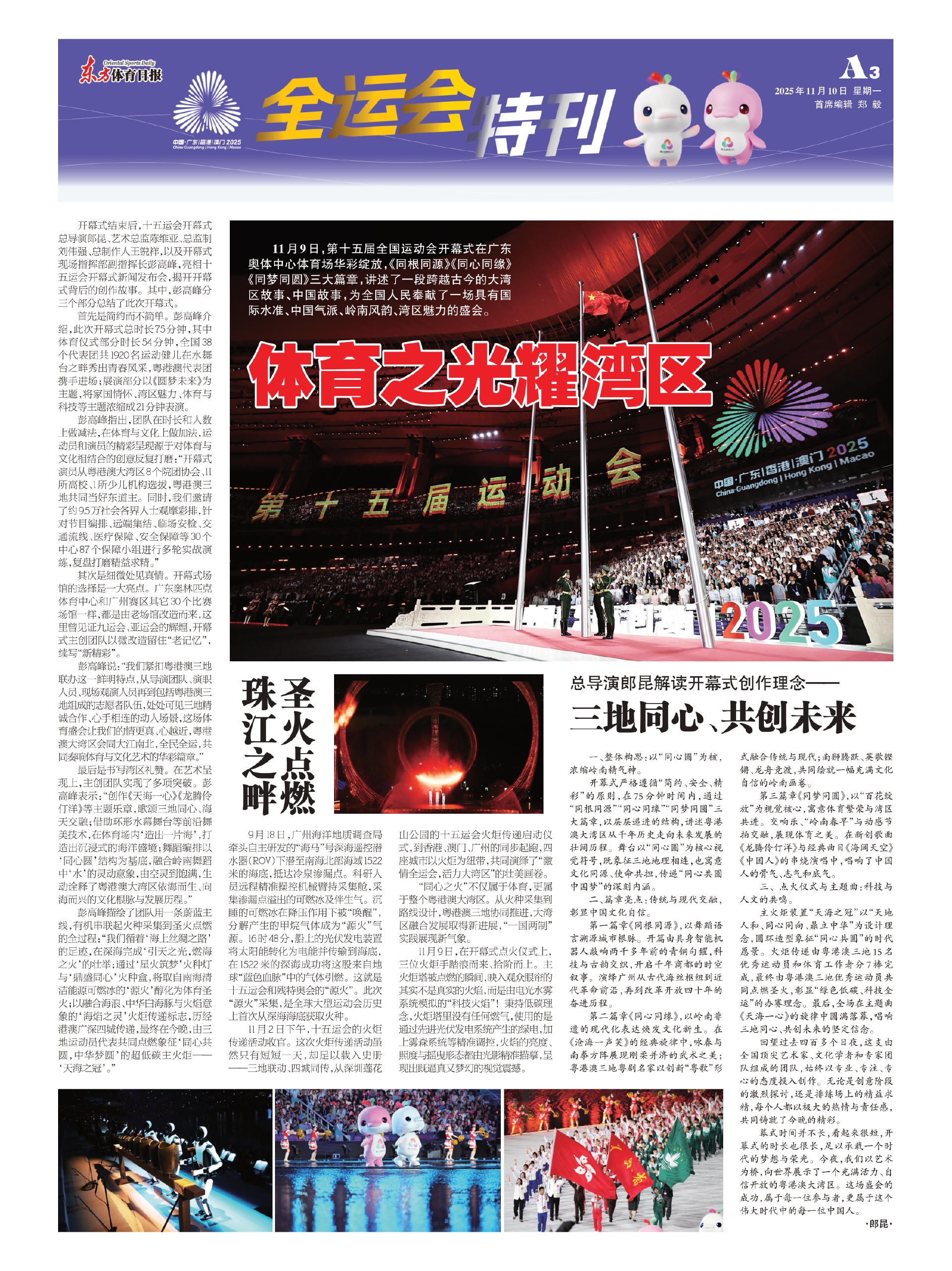11月9日,第十五届全国运动会开幕式在广东奥体中心体育场华彩绽放,《同根同源》《同心同缘》《同梦同圆》三大篇章,讲述了一段跨越古今的大湾区故事、中国故事,为全国人民奉献了一场具有国际水准、中国气派、岭南风韵、湾区魅力的盛会。
