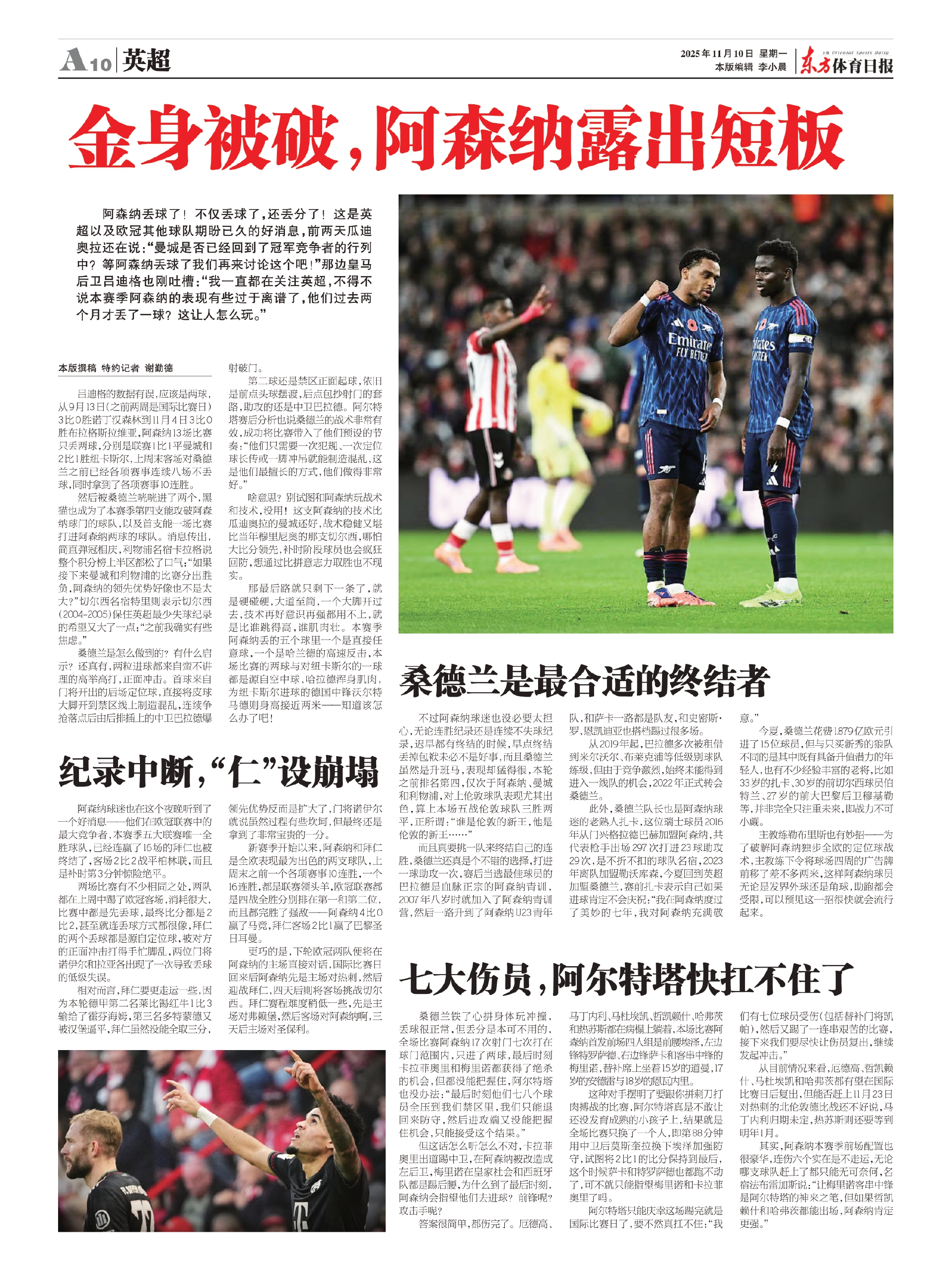 吕迪格的数据有误,应该是两球,从9月13日(之前两周是国际比赛日)3比0胜诺丁汉森林到11月4日3比0胜布拉格斯拉维亚,阿森纳13场比赛只丢两球,分别是联赛1比1平曼城和2比1胜纽卡斯尔,上周末客场对桑德兰之前已经各项赛事连续八场不丢球,同时拿到了各项赛事10连胜。