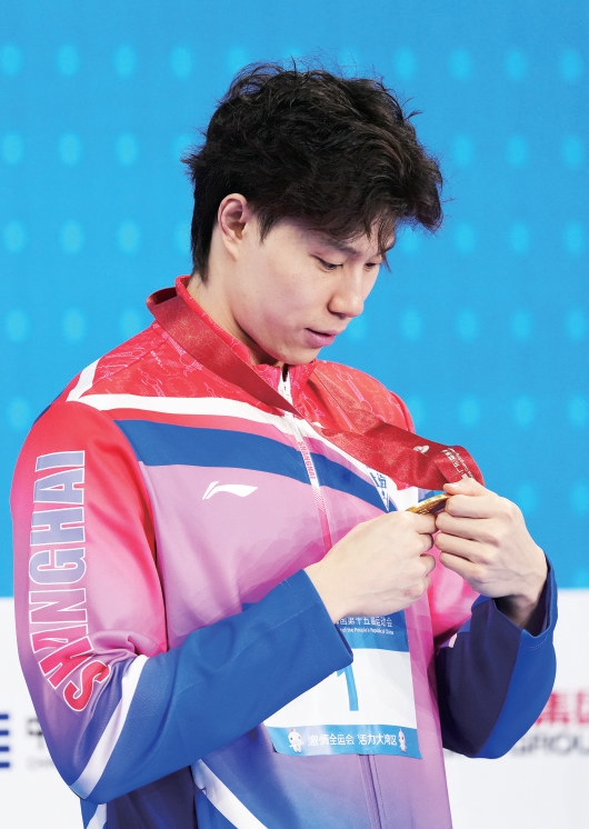 11日,上海队覃海洋首次摘得全运会男子100米蛙泳金牌,成绩58秒98。上海队郑英昊、湖北队闫子贝分获第二、第三名。