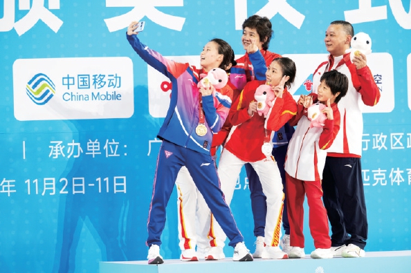 ◀获得跳水女子10米跳台冠军的上海队选手陈芋汐(前左)、获得亚军的四川队选手卢为(前中)、获得季军的山东队选手刘紫涵(前右)在颁奖仪式上与教练自拍合影