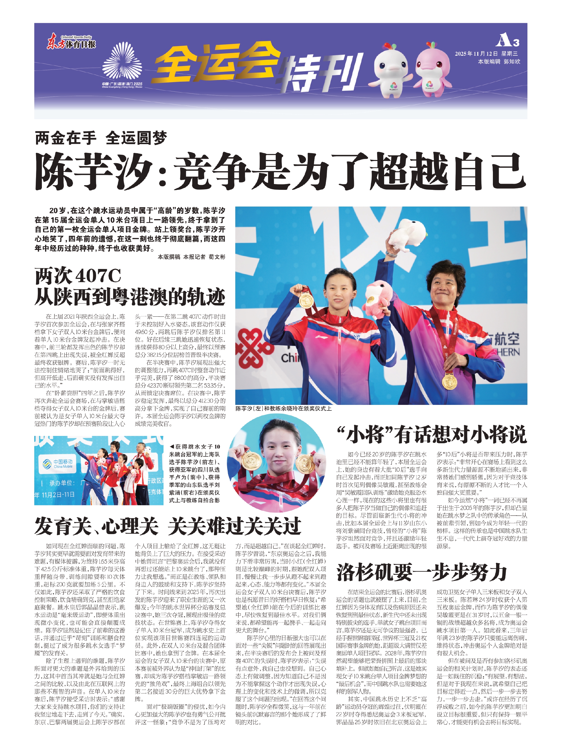 面对“极端饭圈”的侵扰,如今内心更加强大的陈芋汐也有勇气公开批评这一怪象:“竞争不是为了压垮对方,而是超越自己。”在谈起全红婵时,陈芋汐曾说,“东京奥运会之后,我能力下滑非常厉害,当时小红(全红婵)则是比较巅峰的时期,跟她配双人项目,慢慢让我一步步从蹬不起来到蹬起来,心态、能力等都有变化。”本届全运会女子双人10米台决赛后,陈芋汐也是祝愿昔日的好搭档早日恢复:“希望她(全红婵)能在今后的训练比赛中,尽快恢复到最佳水平。对我们俩来说,都希望能再一起携手、一起走向更大的舞台。”