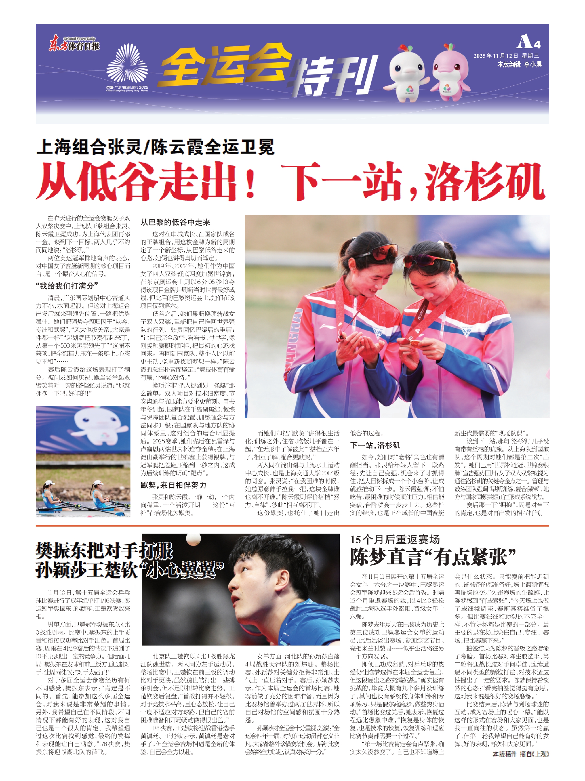 清晨,广东国际划船中心赛道风力不小,水面起浪。但这对上海组合出发后就来到领先位置,一路把优势稳住。她们把强势夺冠归因于“从容、专注和默契”,“风大也没关系,大家条件都一样”“起划就把节奏带起来了,从第一个500米起就领先了”“这届不兼项,把全部精力压在一条艇上,心态更平和”……
